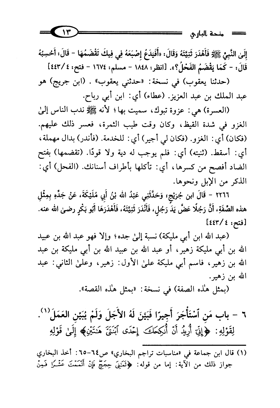 (فكان) أي: الغزو. (فكان لي أجير) أي: للخدمة. (فأندر) بدال مهملة، أي: أسقط. (ثنيته) أي: فلم يوجب له دية ولا قودًا. (تقضمها) بفتح الضاد أفصح من كسرها، أي: تأكلها بأطراف أسنانك. (الفحل) أي: الذكر من الإبل ونحوها.