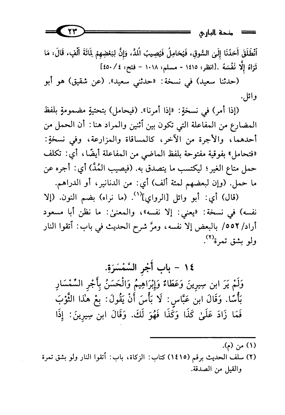 انْطَلَقَ أَحَدُنَا إِلَى السُّوقِ، فَيُحَامِلُ، فَيُصِيبُ المُدَّ، وَإِنَّ لِبَعْضِهِمْ لَمِائَةَ أَلْفٍ" قَال: مَا تَرَاهُ إلا نَفْسَهُ.