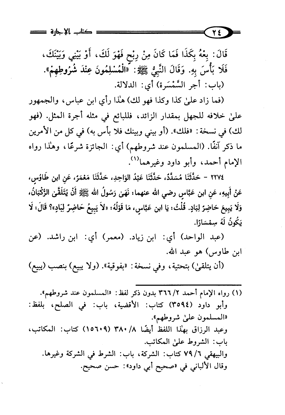 (فما زاد على كذا وكذا فهو لك) هذا رأي ابن عباس، والجمهور على خلافه للجهل بمقدار الزائد، فللبائع في مثله أجرة المثل. (فهو لك) في نسخة: "فلك". (أو بيني وبينك فلا بأس به) في كل من الأمرين ما ذكر آنفًا. (المسلمون عند شروطهم) أي: الجائزة شرعًا، وهذا رواه الإمام أحمد، وأبو داود وغيرهما (¬1).