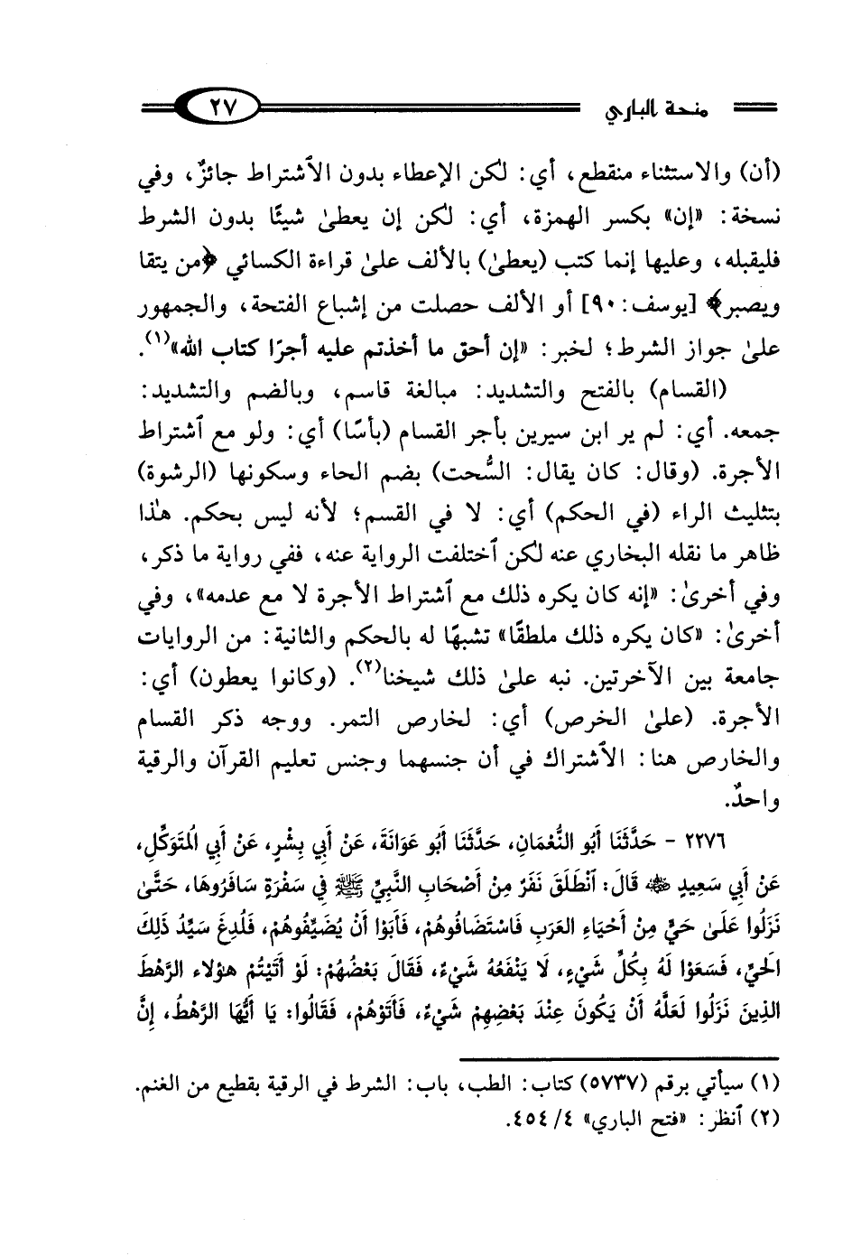 (أن) والاستثناء منقطع، أي: لكن الإعطاء بدون الاشتراط جائزٌ، وفي نسخة: "إن" بكسر الهمزة، أي: لكن إن يعطى شيئًا بدون الشرط فليقبله، وعليها إنما كتب (يعطى) بالألف على قراءة الكسائي {من يتقا ويصبر} [يوسف: 90] أو الألف حصلت من إشباع الفتحة، والجمهور على جواز الشرط؛ لخبر: "إن أحق ما أخذتم عليه أجرًا كتاب الله" (¬1).