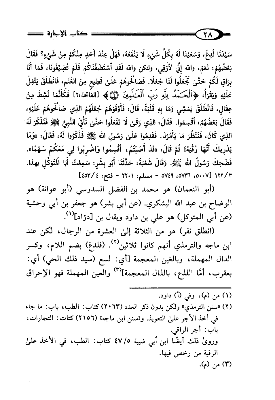 سَيِّدَنَا لُدِغَ، وَسَعَيْنَا لَهُ بِكُلِّ شَيْءٍ لَا يَنْفَعُهُ، فَهَلْ عِنْدَ أَحَدٍ مِنْكُمْ مِنْ شَيْءٍ؟ فَقَال بَعْضُهُمْ: نَعَمْ، وَاللَّهِ إِنِّي لَأَرْقِي، وَلَكِنْ وَاللَّهِ لَقَدِ اسْتَضَفْنَاكُمْ فَلَمْ تُضَيِّفُونَا، فَمَا أَنَا بِرَاقٍ لَكُمْ حَتَّى تَجْعَلُوا لَنَا جُعْلًا، فَصَالحُوهُمْ عَلَى قَطِيعٍ مِنَ الغَنَمِ، فَانْطَلَقَ يَتْفِلُ عَلَيْهِ، وَيَقْرَأُ: الحَمْدُ لِلَّهِ رَبِّ العَالمِينَ فَكَأَنَّمَا نُشِطَ مِنْ عِقَالٍ، فَانْطَلَقَ يَمْشِي وَمَا بِهِ قَلَبَةٌ، قَال: فَأَوْفَوْهُمْ جُعْلَهُمُ الَّذِي صَالحُوهُمْ عَلَيْهِ، فَقَال بَعْضُهُمْ: اقْسِمُوا، فَقَال الَّذِي رَقَى: لَا تَفْعَلُوا حَتَّى نَأْتِيَ النَّبِيَّ صَلَّى اللهُ عَلَيْهِ وَسَلَّمَ فَنَذْكُرَ لَهُ الَّذِي كَانَ، فَنَنْظُرَ مَا يَأْمُرُنَا، فَقَدِمُوا عَلَى رَسُولِ اللَّهِ صَلَّى اللهُ عَلَيْهِ وَسَلَّمَ فَذَكَرُوا لَهُ، فَقَال: "وَمَا يُدْرِيكَ أَنَّهَا رُقْيَةٌ"، ثُمَّ قَال: "قَدْ أَصَبْتُمْ، اقْسِمُوا، وَاضْرِبُوا لِي مَعَكُمْ سَهْمًا" فَضَحِكَ رَسُولُ اللَّهِ صَلَّى اللهُ عَلَيْهِ وَسَلَّمَ، قَال أَبُو عَبْدِ اللَّهِ: وَقَال شُعْبَةُ: حَدَّثَنَا أَبُو بِشْرٍ، سَمِعْتُ أَبَا المُتَوَكِّلِ، بِهَذَا. 3/ 122 [5007, 5736, 5749 - مسلم: 2201 - فتح: 4/ 453]