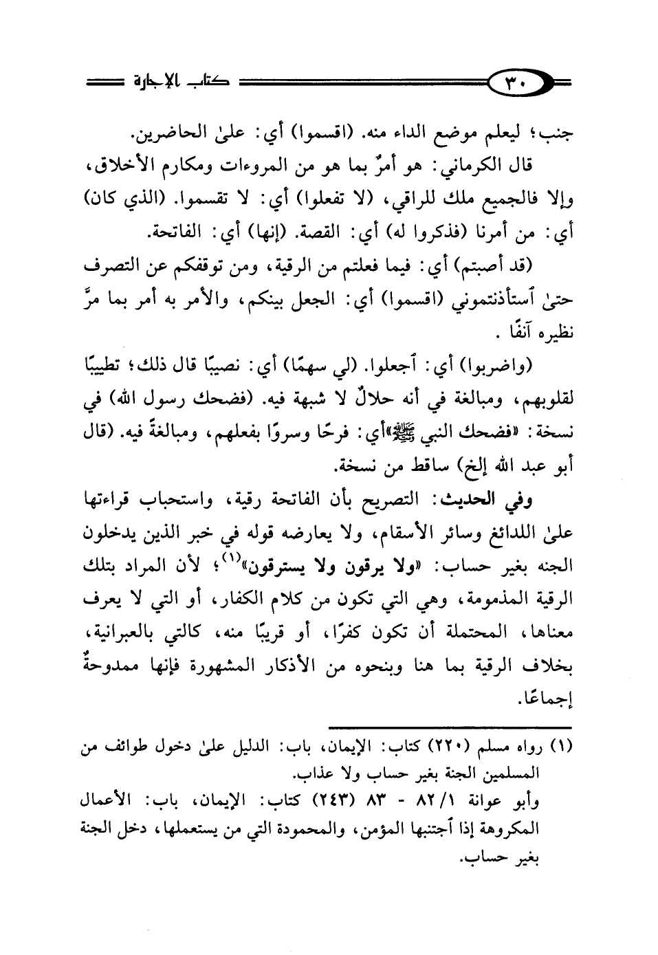 وفي الحديث: التصريح بأن الفاتحة رقية، واستحباب قراءتها على اللدائغ وسائر الأسقام، ولا يعارضه قوله في خبر الذين يدخلون الجنه بغير حساب: "ولا يرقون ولا يسترقون" (¬1)؛ لأن المراد بتلك الرقية المذمومة، وهي التي تكون من كلام الكفار، أو التي لا يعرف معناها، المحتملة أن تكون كفرًا، أو قريبًا منه، كالتي بالعبرانية، بخلاف الرقية بما هنا وبنحوه من الأذكار المشهورة فإنها ممدوحةٌ إجماعًا.
