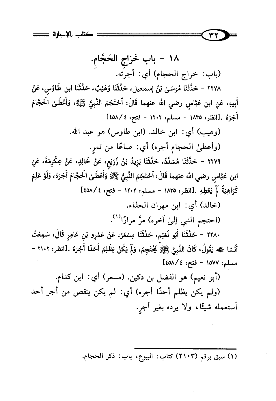 2280 - حَدَّثَنَا أَبُو نُعَيْمٍ، حَدَّثَنَا مِسْعَرٌ، عَنْ عَمْرِو بْنِ عَامِرٍ، قَال: سَمِعْتُ أَنَسًا رَضِيَ اللَّهُ عَنْهُ، يَقُولُ: "كَانَ النَّبِيُّ صَلَّى اللهُ عَلَيْهِ وَسَلَّمَ يَحْتَجِمُ وَلَمْ يَكُنْ يَظْلِمُ أَحَدًا أَجْرَهُ".