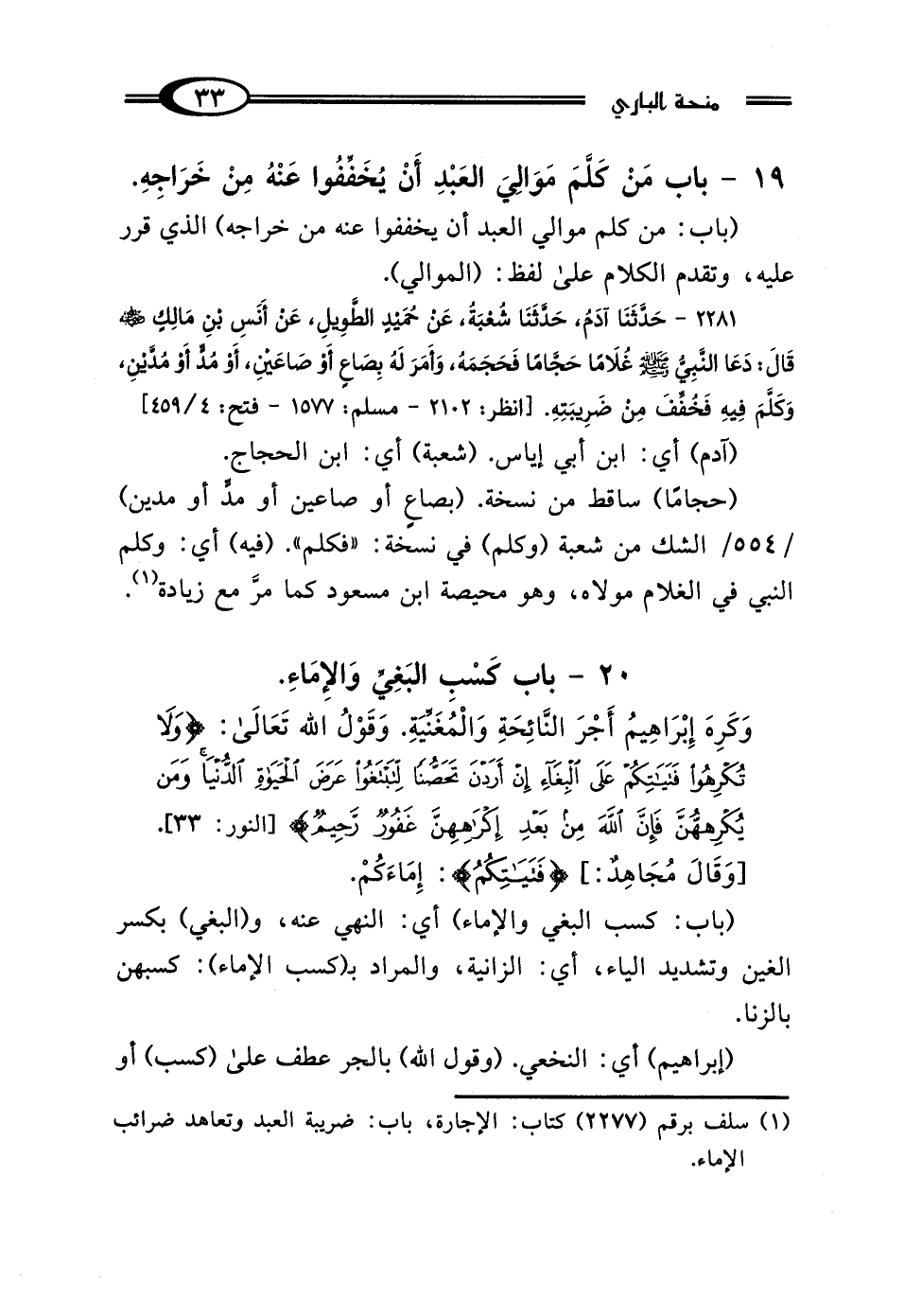 19 - بَابُ مَنْ كَلَّمَ مَوَالِيَ العَبْدِ: أَنْ يُخَفِّفُوا عَنْهُ مِنْ خَرَاجِهِ