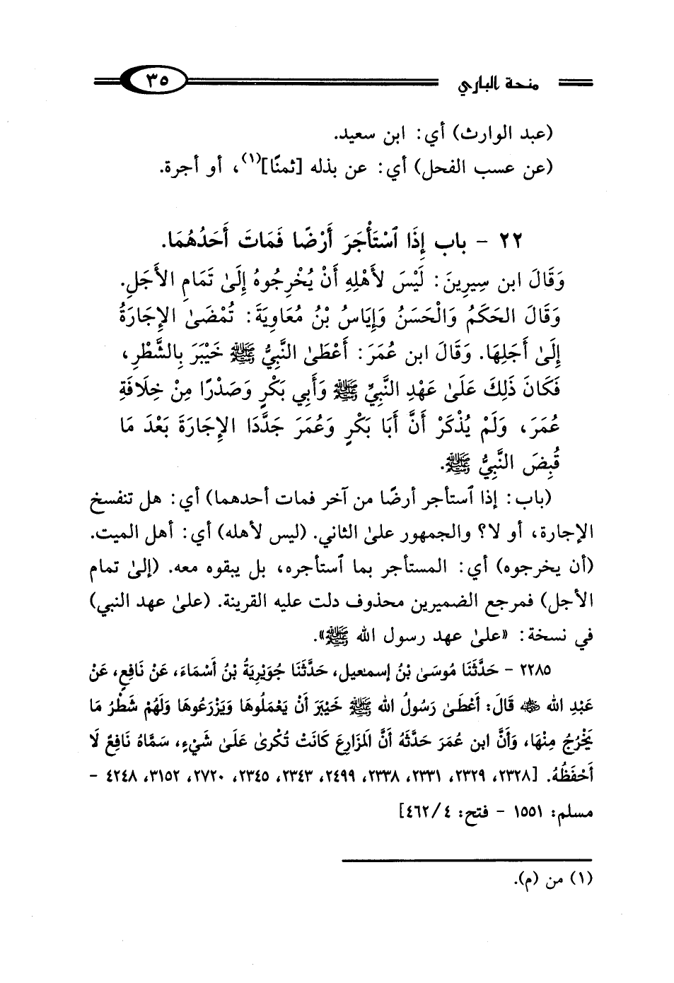 (باب: إذا استأجر أرضًا من آخر فمات أحدهما) أي: هل تنفسخ الإجارة، أو لا؟ والجمهور على الثاني. (ليس لأهله) أي: أهل الميت. (أن يخرجوه) أي: المستأجر بما استأجره، بل يبقوه معه. (إلى تمام الأجل) فمرجع الضميرين محذوف دلت عليه القرينة. (على عهد النبي) في نسخة: "على عهد رسول الله - صلى الله عليه وسلم -.