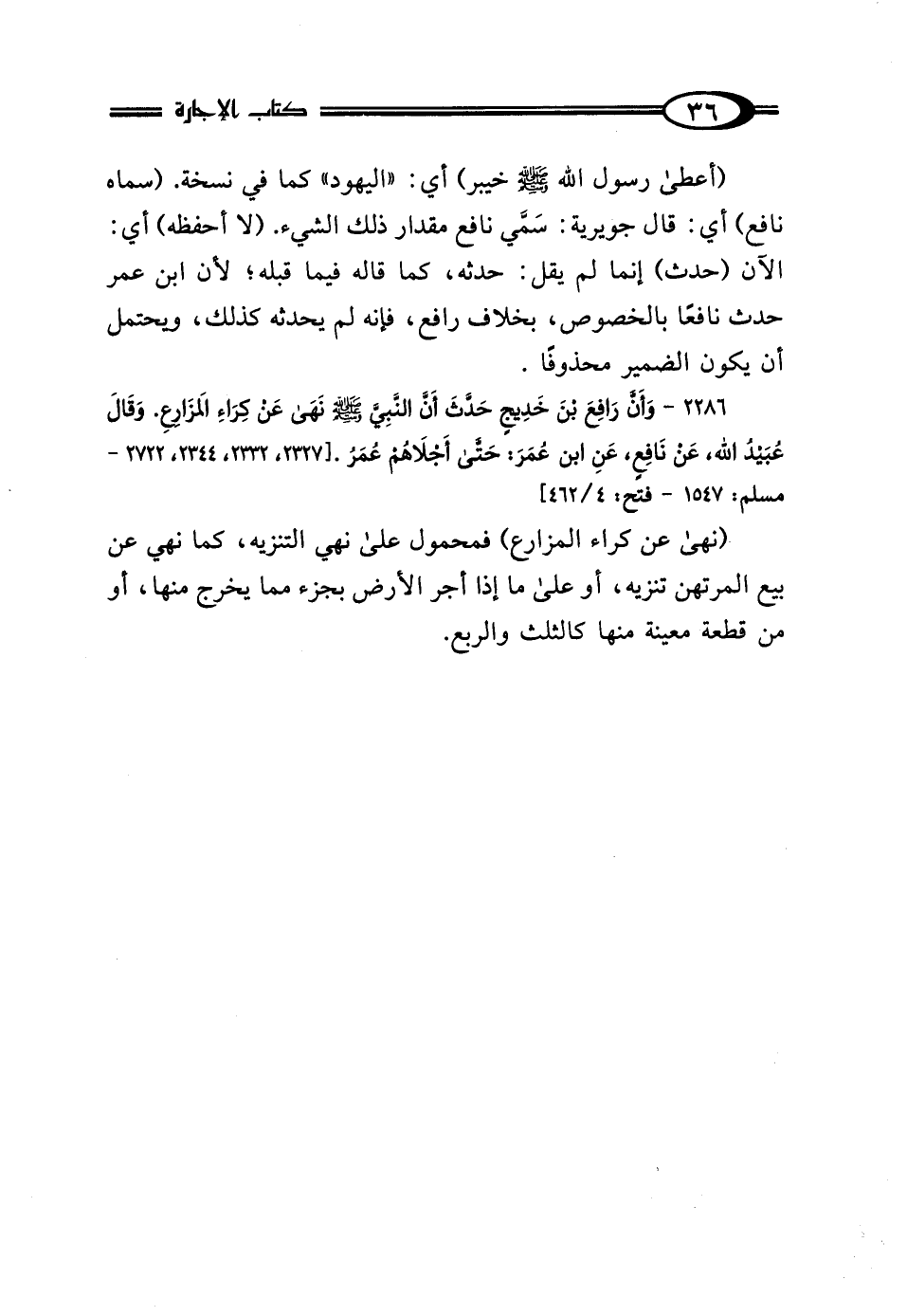 2286 - وَأَنَّ رَافِعَ بْنَ خَدِيجٍ حَدَّثَ: "أَنَّ النَّبِيَّ صَلَّى اللهُ عَلَيْهِ وَسَلَّمَ نَهَى عَنْ كِرَاءِ المَزَارِعِ"، وَقَال عُبَيْدُ اللَّهِ: عَنْ نَافِعٍ، عَنِ ابْنِ عُمَرَ: "حَتَّى أَجْلاهُمْ عُمَرُ".