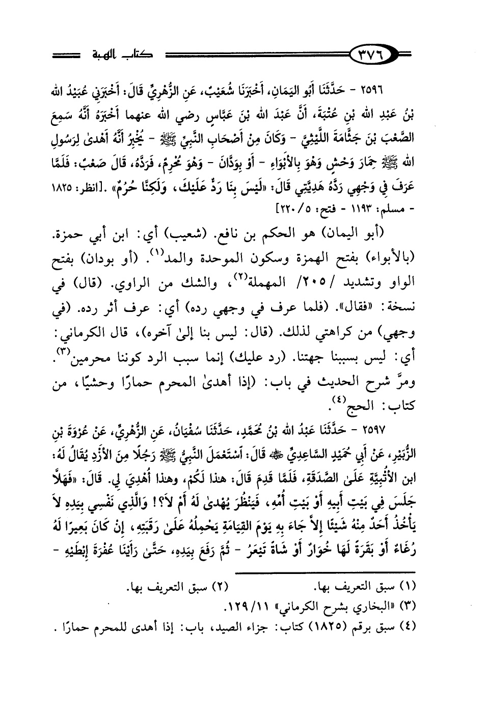 2596 - حَدَّثَنَا أَبُو اليَمَانِ، أَخْبَرَنَا شُعَيْبٌ، عَنِ الزُّهْرِيِّ، قَال: أَخْبَرَنِي عُبَيْدُ اللَّهِ بْنُ عَبْدِ اللَّهِ بْنِ عُتْبَةَ، أَنَّ عَبْدَ اللَّهِ بْنَ عَبَّاسٍ رَضِيَ اللَّهُ عَنْهُمَا أَخْبَرَهُ، أَنَّهُ سَمِعَ الصَّعْبَ بْنَ جَثَّامَةَ اللَّيْثِيَّ - وَكَانَ مِنْ أَصْحَابِ النَّبِيِّ صَلَّى اللهُ عَلَيْهِ وَسَلَّمَ - يُخْبِرُ أَنَّهُ أَهْدَى لِرَسُولِ اللَّهِ صَلَّى اللهُ عَلَيْهِ وَسَلَّمَ حِمَارَ وَحْشٍ وَهُوَ بِالأَبْوَاءِ - أَوْ بِوَدَّانَ - وَهُوَ مُحْرِمٌ، فَرَدَّهُ، قَال صَعْبٌ: فَلَمَّا عَرَفَ فِي وَجْهِي رَدَّهُ هَدِيَّتِي قَال: "لَيْسَ بِنَا رَدٌّ عَلَيْكَ وَلَكِنَّا حُرُمٌ".