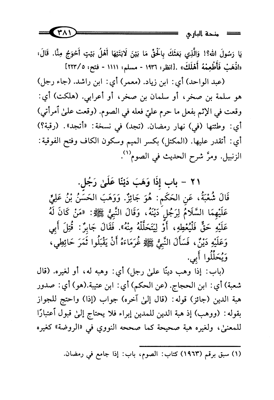(عبد الواحد) أي: ابن زياد. (معمر) أي: ابن راشد. (جاء رجل) هو سلمة بن صخر، أو سلمان بن صخر، أو أعرابي. (هلكت) أي: وقعت في الإثم بفعل ما حرم على فعله في الصوم. (وقعت على امرأتي) أي: وطئتها (في) نهار رمضان. (تجد) في نسخة: "أتجد". (رقبة؟) أي: أتقدر عليها. (المكتل) بكسر الميم وسكون الكاف وفتح الفوقية: الزنبيل. ومرَّ شرح الحديث في الصوم (¬1).