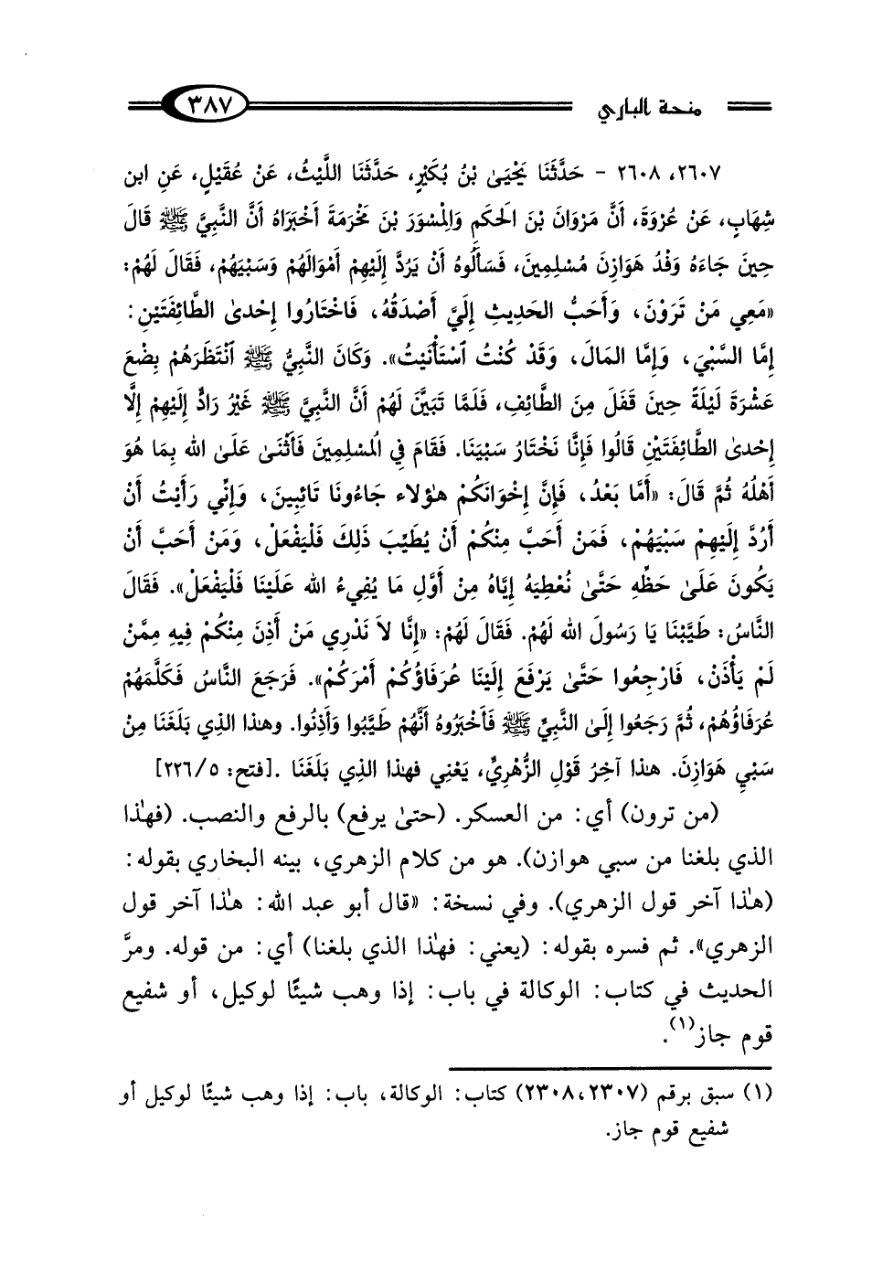 2607، 2608 - حَدَّثَنَا يَحْيَى بْنُ بُكَيْرٍ، حَدَّثَنَا اللَّيْثُ، عَنْ عُقَيْلٍ، عَنِ ابْنِ شِهَابٍ، عَنْ عُرْوَةَ، أَنَّ مَرْوَانَ بْنَ الحَكَمِ، وَالمِسْوَرَ بْنَ مَخْرَمَةَ، أَخْبَرَاهُ أَنَّ النَّبِيَّ صَلَّى اللهُ عَلَيْهِ وَسَلَّمَ قَال حِينَ جَاءَهُ وَفْدُ هَوَازِنَ مُسْلِمِينَ، فَسَأَلُوهُ أَنْ يَرُدَّ إِلَيْهِمْ أَمْوَالهُمْ وَسَبْيَهُمْ، فَقَال لَهُمْ: "مَعِي مَنْ تَرَوْنَ وَأَحَبُّ الحَدِيثِ إِلَيَّ أَصْدَقُهُ، فَاخْتَارُوا إِحْدَى الطَّائِفَتَيْنِ: إِمَّا السَّبْيَ وَإِمَّا المَال، وَقَدْ كُنْتُ اسْتَأْنَيْتُ"، وَكَانَ النَّبِيُّ صَلَّى اللهُ عَلَيْهِ وَسَلَّمَ انْتَظَرَهُمْ بِضْعَ عَشْرَةَ لَيْلَةً حِينَ قَفَلَ مِنَ الطَّائِفِ، فَلَمَّا تَبَيَّنَ لَهُمْ أَنَّ النَّبِيَّ صَلَّى اللهُ عَلَيْهِ وَسَلَّمَ غَيْرُ رَادٍّ إِلَيْهِمْ إلا إِحْدَى الطَّائِفَتَيْنِ، قَالُوا: فَإِنَّا نَخْتَارُ سَبْيَنَا، فَقَامَ فِي المُسْلِمِينَ، فَأَثْنَى عَلَى اللَّهِ بِمَا هُوَ أَهْلُهُ، ثُمَّ قَال: "أَمَّا بَعْدُ، فَإِنَّ إِخْوَانَكُمْ هَؤُلاءِ جَاءُونَا تَائِبِينَ وَإِنِّي رَأَيْتُ أَنْ أَرُدَّ إِلَيْهِمْ سَبْيَهُمْ، فَمَنْ أَحَبَّ مِنْكُمْ أَنْ يُطَيِّبَ ذَلِكَ، فَلْيَفْعَلْ وَمَنْ أَحَبَّ أَنْ يَكُونَ عَلَى حَظِّهِ حَتَّى نُعْطِيَهُ إِيَّاهُ مِنْ أَوَّلِ مَا يُفِيءُ اللَّهُ عَلَيْنَا فَلْيَفْعَلْ"، فَقَال النَّاسُ: طَيَّبْنَا يَا رَسُولَ اللَّهِ لَهُمْ، فَقَال لَهُمْ: "إِنَّا لَا نَدْرِي مَنْ أَذِنَ مِنْكُمْ فِيهِ مِمَّنْ لَمْ يَأْذَنْ، فَارْجِعُوا حَتَّى يَرْفَعَ إِلَيْنَا عُرَفَاؤُكُمْ أَمْرَكُمْ"، فَرَجَعَ النَّاسُ، فَكَلَّمَهُمْ عُرَفَاؤُهُمْ، ثُمَّ رَجَعُوا إِلَى النَّبِيِّ صَلَّى اللهُ عَلَيْهِ وَسَلَّمَ، فَأَخْبَرُوهُ أَنَّهُمْ طَيَّبُوا، وَأَذِنُوا وَهَذَا الَّذِي بَلَغَنَا مِنْ سَبْيِ هَوَازِنَ، هَذَا آخِرُ قَوْلِ الزُّهْرِيِّ "يَعْنِي فَهَذَا الَّذِي بَلَغَنَا".