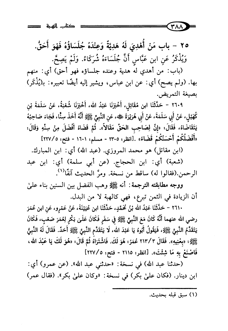 2609 - حَدَّثَنَا ابْنُ مُقَاتِلٍ، أَخْبَرَنَا عَبْدُ اللَّهِ، أَخْبَرَنَا شُعْبَةُ، عَنْ سَلَمَةَ بْنِ كُهَيْلٍ، عَنْ أَبِي سَلَمَةَ، عَنْ أَبِي هُرَيْرَةَ رَضِيَ اللَّهُ عَنْهُ، عَنِ النَّبِيِّ صَلَّى اللهُ عَلَيْهِ وَسَلَّمَ أَنَّهُ أَخَذَ سِنًّا، فَجَاءَ صَاحِبُهُ يَتَقَاضَاهُ، فَقَالُوا لَهُ: فَقَال: "إِنَّ لِصَاحِبِ الحَقِّ مَقَالًا"، ثُمَّ قَضَاهُ أَفْضَلَ مِنْ سِنِّهِ، وَقَال: "أَفْضَلُكُمْ أَحْسَنُكُمْ قَضَاءً".
