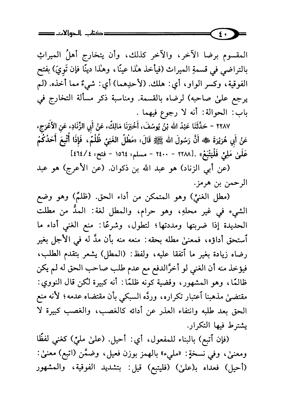 2287 - حَدَّثَنَا عَبْدُ اللَّهِ بْنُ يُوسُفَ، أَخْبَرَنَا مَالِكٌ، عَنْ أَبِي الزِّنَادِ، عَنِ الأَعْرَجِ، عَنْ أَبِي هُرَيْرَةَ رَضِيَ اللَّهُ عَنْهُ: أَنَّ رَسُولَ اللَّهِ صَلَّى اللهُ عَلَيْهِ وَسَلَّمَ قَال: "مَطْلُ الغَنِيِّ ظُلْمٌ، فَإِذَا أُتْبِعَ أَحَدُكُمْ عَلَى مَلِيٍّ فَلْيَتْبَعْ".