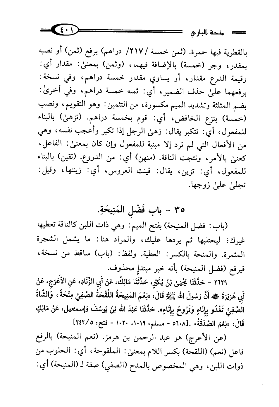 (باب: فضل المنيحة) بفتح الميم: وهي ذات اللبن كالناقة تعطيها غيرك: ليحتلبها ثم يردها عليك، والمراد هنا: ما يشمل الشجرة المثمرة. والمنحة بالكسر: العطية. ولفظ: (باب) ساقط من نسخة، فيرفع (فضل المنيحة) بأنه خبر مبتدإِ محذوف.