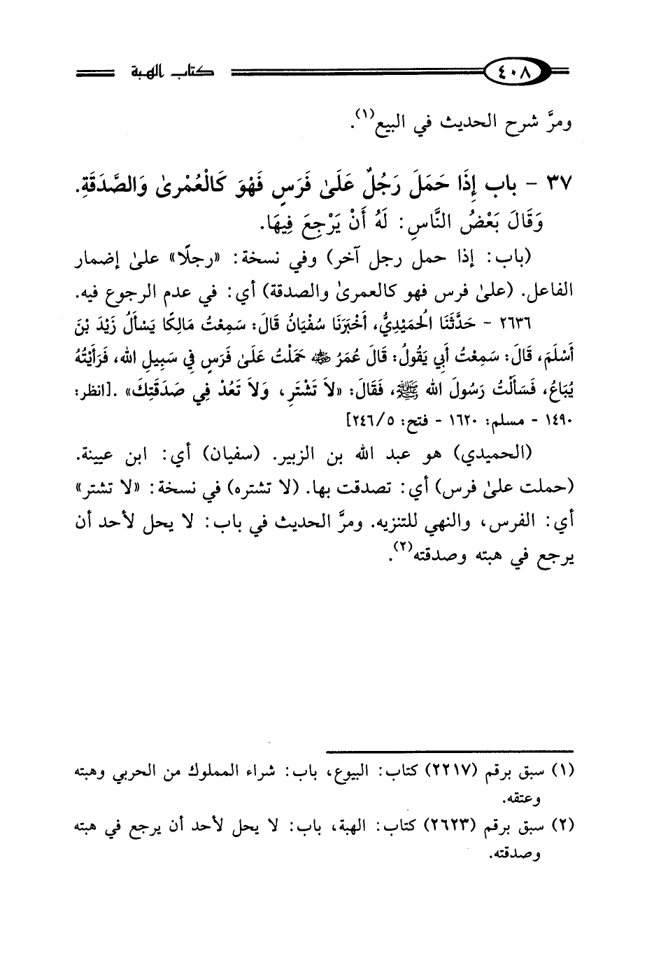 (الحميدي) هو عبد الله بن الزبير. (سفيان) أي: ابن عيينة. (حملت على فرس) أي: تصدقت بها. (لا تشتره) في نسخة: "لا تشتر" أي: الفرس، والنهي للتنزيه. ومرَّ الحديث في باب: لا يحل لأحد أن يرجع في هبته وصدقته (¬2).