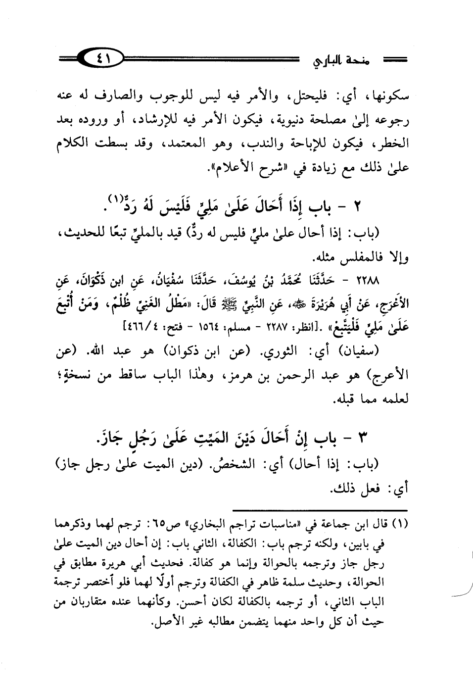 (¬1) قال ابن جماعة في "مناسبات تراجم البخاري" ص 65: ترجم لهما وذكرهما في بابين، ولكنه ترجم باب: الكفالة، الثاني باب: إن أحال دين الميت على رجل جاز وترجمه بالحوالة وإنما هو كفالة. فحديث أبي هريرة مطابق في الحوالة، وحديث سلمة ظاهر في الكفالة وترجم أولًا لهما فلو اختصر ترجمة الباب الثاني، أو ترجمه بالكفالة لكان أحسن. وكأنهما عنده متقاربان من حيث أن كل واحد منهما يتضمن مطالبه غير الأصل.