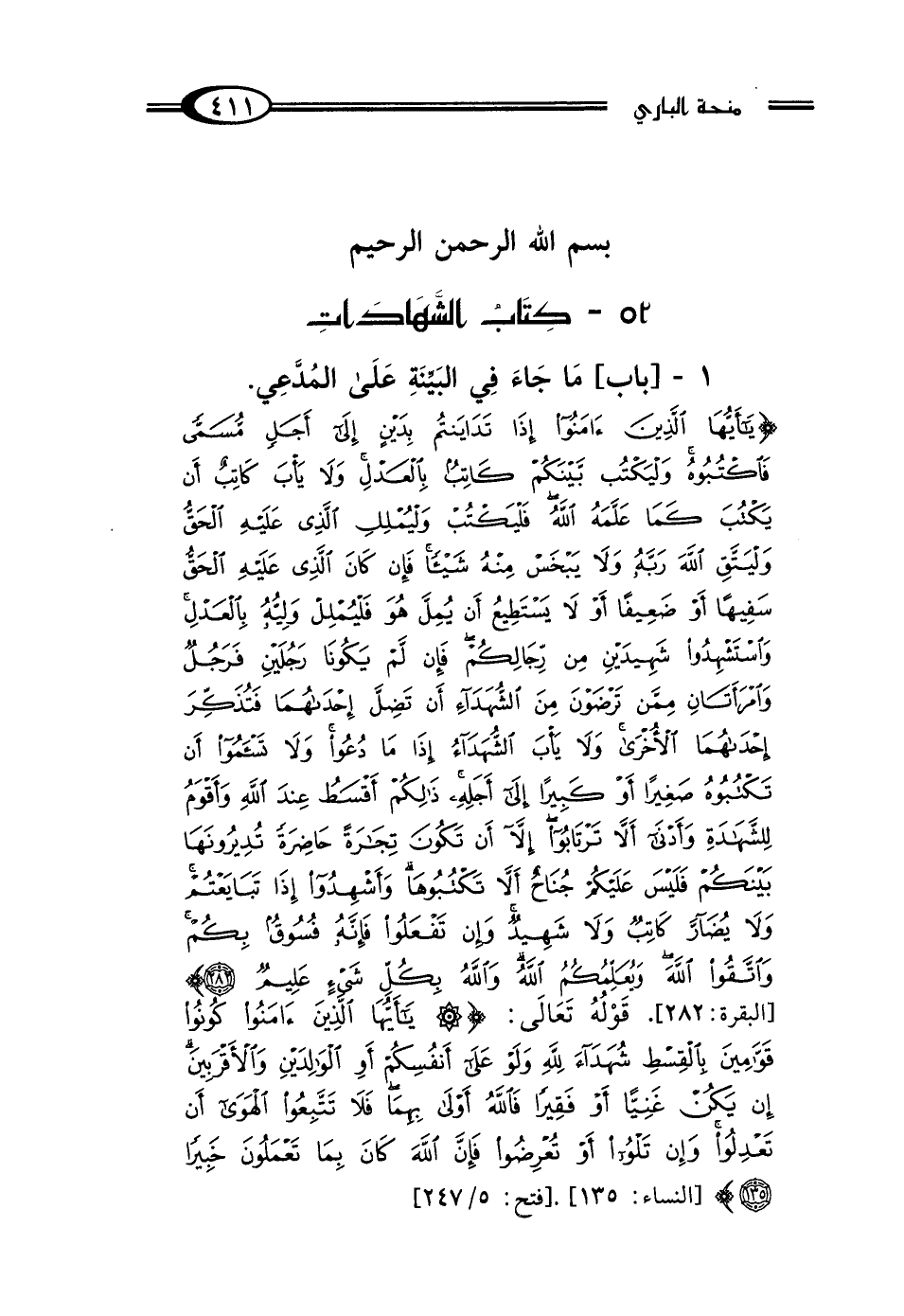 لِقَوْلِهِ تَعَالَى: {يَا أَيُّهَا الَّذِينَ آمَنُوا إِذَا تَدَايَنْتُمْ بِدَيْنٍ إِلَى أَجَلٍ مُسَمًّى فَاكْتُبُوهُ، وَلْيَكْتُبْ بَيْنَكُمْ كَاتِبٌ بِالعَدْلِ، وَلاَ يَأْبَ كَاتِبٌ أَنْ يَكْتُبَ كَمَا عَلَّمَهُ اللَّهُ، فَلْيَكْتُبْ وَلْيُمْلِلِ الَّذِي عَلَيْهِ الحَقُّ، وَلْيَتَّقِ اللَّهَ رَبَّهُ، وَلاَ يَبْخَسْ مِنْهُ شَيْئًا، فَإِنْ كَانَ الَّذِي عَلَيْهِ الحَقُّ سَفِيهًا أَوْ ضَعِيفًا أَوْ لاَ يَسْتَطِيعُ أَنْ يُمِلَّ هُوَ فَلْيُمْلِلْ وَلِيُّهُ بِالعَدْلِ، وَاسْتَشْهِدُوا شَهِيدَيْنِ مِنْ رِجَالِكُمْ، فَإِنْ لَمْ يَكُونَا رَجُلَيْنِ، فَرَجُلٌ وَامْرَأَتَانِ مِمَّنْ تَرْضَوْنَ مِنَ الشُّهَدَاءِ، أَنْ تَضِلَّ إِحْدَاهُمَا فَتُذَكِّرَ إِحْدَاهُمَا الأُخْرَى، وَلاَ يَأْبَ الشُّهَدَاءُ إِذَا مَا دُعُوا، وَلاَ تَسْأَمُوا أَنْ تَكْتُبُوهُ صَغِيرًا أَوْ كَبِيرًا إِلَى أَجَلِهِ، ذَلِكُمْ أَقْسَطُ عِنْدَ اللَّهِ وَأَقْوَمُ لِلشَّهَادَةِ وَأَدْنَى أَنْ لاَ تَرْتَابُوا إِلَّا أَنْ تَكُونَ تِجَارَةً حَاضِرَةً تُدِيرُونَهَا بَيْنَكُمْ، فَلَيْسَ عَلَيْكُمْ جُنَاحٌ أَنْ لاَ تَكْتُبُوهَا، وَأَشْهِدُوا إِذَا تَبَايَعْتُمْ، وَلاَ يُضَارَّ كَاتِبٌ وَلاَ شَهِيدٌ، وَإِنْ تَفْعَلُوا فَإِنَّهُ فُسُوقٌ بِكُمْ، وَاتَّقُوا اللَّهَ وَيُعَلِّمُكُمُ اللَّهُ، وَاللَّهُ بِكُلِّ شَيْءٍ عَلِيمٌ} وَقَوْلِ اللَّهِ عَزَّ وَجَلَّ: {يَا أَيُّهَا الَّذِينَ آمَنُوا كُونُوا قَوَّامِينَ بِالقِسْطِ شُهَدَاءَ لِلَّهِ، وَلَوْ عَلَى أَنْفُسِكُمْ أَوِ الوَالِدَيْنِ وَالأَقْرَبِينَ إِنْ يَكُنْ غَنِيًّا أَوْ فَقِيرًا، فَاللَّهُ أَوْلَى بِهِمَا فَلاَ تَتَّبِعُوا الهَوَى، أَنْ تَعْدِلُوا وَإِنْ تَلْوُوا أَوْ تُعْرِضُوا، فَإِنَّ اللَّهَ كَانَ بِمَا تَعْمَلُونَ خَبِيرًا} [النساء: 135].