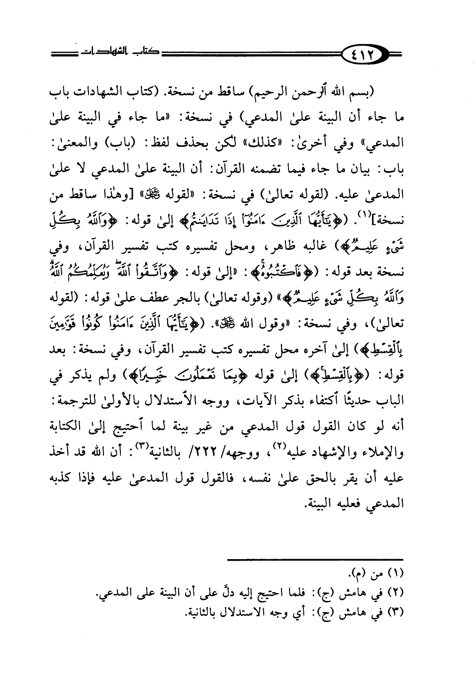(بِسْمِ اللَّهِ الرَّحْمَنِ الرَّحِيمِ) ساقط من نسخة. (كتاب الشهادات باب ما جاء أن البينة على المدعي) في نسخة: "ما جاء في البينة على المدعي" وفي أخرى: "كذلك" لكن بحذف لفظ: (باب) والمعنى: باب: بيان ما جاء فيما تضمنه القرآن: أن البينة على المدعي لا على المدعى عليه. (لقوله تعالى) في نسخة: "لقوله -عَزَّ وَجَلَّ- " [وهذا ساقط من نسخة] (¬1). ({يَا أَيُّهَا الَّذِينَ آمَنُوا إِذَا تَدَايَنْتُمْ} إلى قوله: {وَاللَّهُ بِكُلِّ شَيْءٍ عَلِيمٌ}) غالبه ظاهر، ومحل تفسيره كتب تفسير القرآن، وفي نسخة بعد قوله: ({فَاكْتُبُوهُ}: "إلى قوله: {وَاتَّقُوا اللَّهَ وَيُعَلِّمُكُمُ اللَّهُ وَاللَّهُ بِكُلِّ شَيْءٍ عَلِيمٌ} " (وقوله تعالى) بالجر عطف على قوله: (لقوله تعالى)، وفي نسخة: "وقول الله -عَزَّ وَجَلَّ-". ({يَا أَيُّهَا الَّذِينَ آمَنُوا كُونُوا قَوَّامِينَ بِالْقِسْطِ}) إلى آخره محل تفسيره كتب تفسير القرآن، وفي نسخة: بعد قوله: ({بِالْقِسْطِ}) إلى قوله {بِمَا تَعْمَلُونَ خَبِيرًا}) ولم يذكر في الباب حديثًا اكتفاء بذكر الآيات، ووجه الاستدلال بالأولى للترجمة: أنه لو كان القول قول المدعي من غير بينة لما احتيج إلى الكتابة والإملاء والإشهاد عليه (¬2)، بالثانية (¬3): أن الله قد أخذ عليه أن يقر بالحق على نفسه، فالقول قول المدعى عليه فإذا كذبه المدعي فعليه البينة.