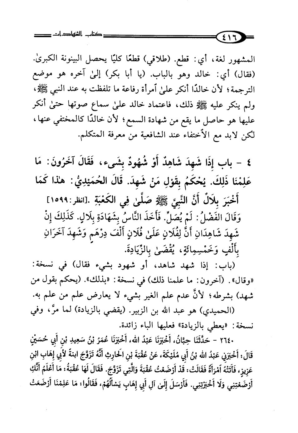 [انظر: 1599] وَقَال الفَضْلُ: "لَمْ يُصَلِّ" فَأَخَذَ النَّاسُ بِشَهَادَةِ بِلالٍ " كَذَلِكَ إِنْ شَهِدَ شَاهِدَانِ: أَنَّ لِفُلانٍ عَلَى فُلانٍ أَلْفَ دِرْهَمٍ، وَشَهِدَ آخَرَانِ بِأَلْفٍ وَخَمْسِ مِائَةٍ يُقْضَى بِالزِّيَادَةِ".
