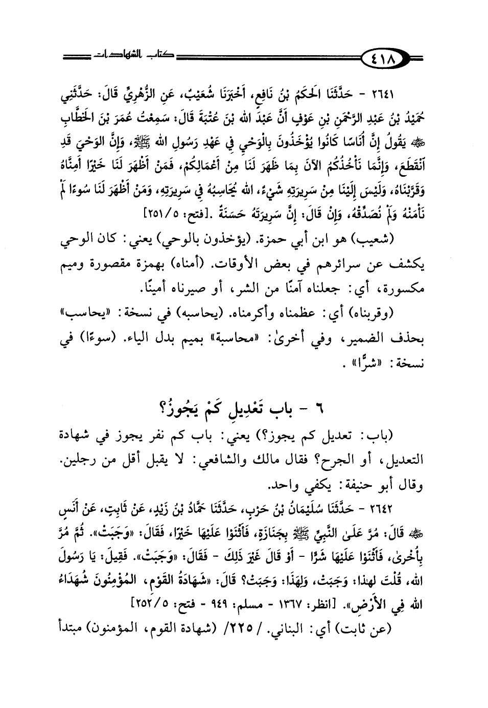 2641 - حَدَّثَنَا الحَكَمُ بْنُ نَافِعٍ، أَخْبَرَنَا شُعَيْبٌ، عَنِ الزُّهْرِيِّ، قَال: حَدَّثَنِي حُمَيْدُ بْنُ عَبْدِ الرَّحْمَنِ بْنِ عَوْفٍ، أَنَّ عَبْدَ اللَّهِ بْنَ عُتْبَةَ، قَال: سَمِعْتُ عُمَرَ بْنَ الخَطَّابِ رَضِيَ اللَّهُ عَنْهُ، يَقُولُ: "إِنَّ أُنَاسًا كَانُوا يُؤْخَذُونَ بِالوَحْيِ فِي عَهْدِ رَسُولِ اللَّهِ صَلَّى اللهُ عَلَيْهِ وَسَلَّمَ، وَإِنَّ الوَحْيَ قَدِ انْقَطَعَ، وَإِنَّمَا نَأْخُذُكُمُ الآنَ بِمَا ظَهَرَ لَنَا مِنْ أَعْمَالِكُمْ، فَمَنْ أَظْهَرَ لَنَا خَيْرًا، أَمِنَّاهُ، وَقَرَّبْنَاهُ، وَلَيْسَ إِلَيْنَا مِنْ سَرِيرَتِهِ شَيْءٌ اللَّهُ يُحَاسِبُهُ فِي سَرِيرَتِهِ، وَمَنْ أَظْهَرَ لَنَا سُوءًا لَمْ نَأْمَنْهُ، وَلَمْ نُصَدِّقْهُ، وَإِنْ قَال: إِنَّ سَرِيرَتَهُ حَسَنَةٌ".