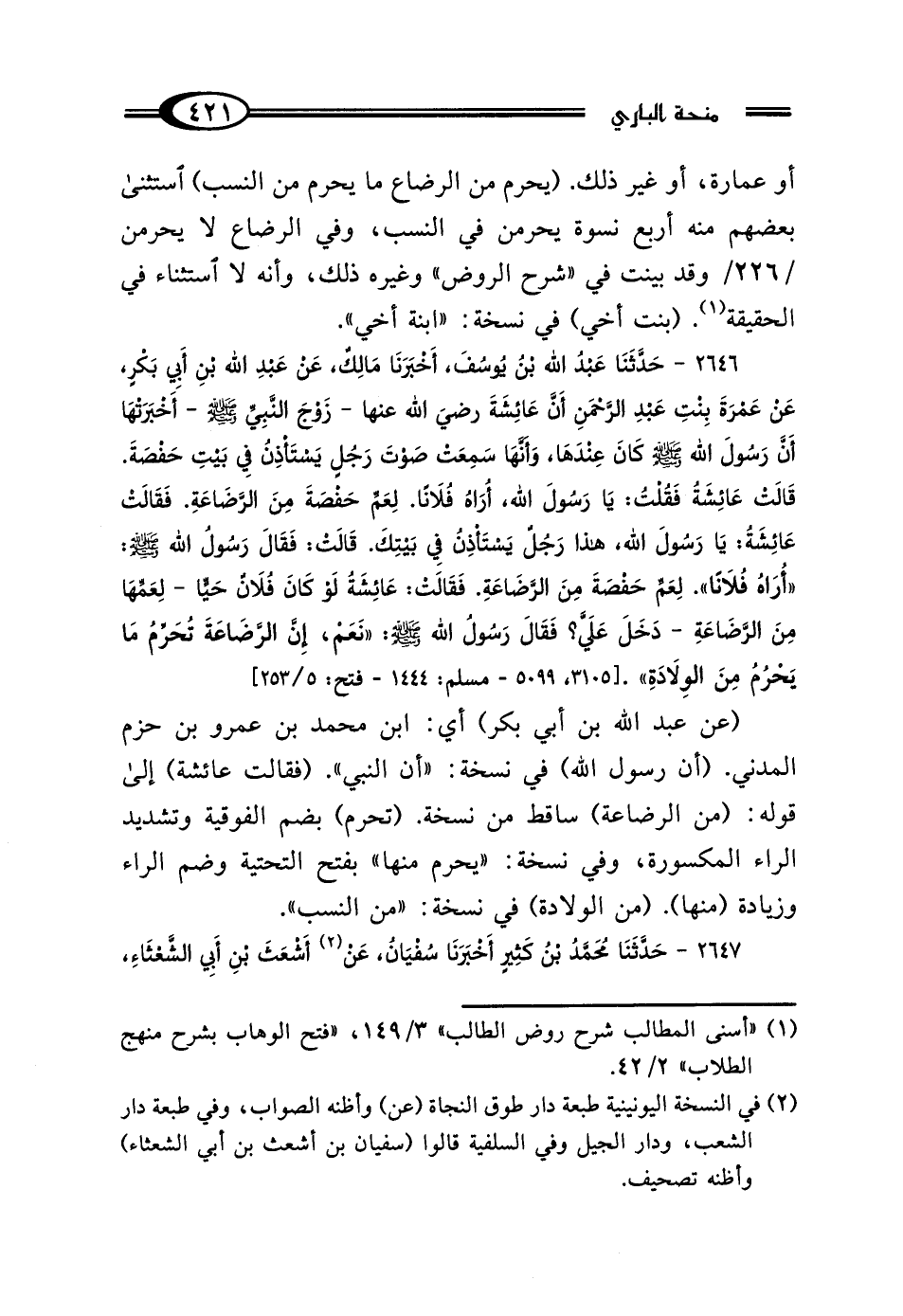 2646 - حَدَّثَنَا عَبْدُ اللَّهِ بْنُ يُوسُفَ، أَخْبَرَنَا مَالِكٌ، عَنْ عَبْدِ اللَّهِ بْنِ أَبِي بَكْرٍ، عَنْ عَمْرَةَ بِنْتِ عَبْدِ الرَّحْمَنِ، أَنَّ عَائِشَةَ رَضِيَ اللَّهُ عَنْهَا، زَوْجَ النَّبِيِّ صَلَّى اللهُ عَلَيْهِ وَسَلَّمَ، أَخْبَرَتْهَا: أَنَّ رَسُولَ اللَّهِ صَلَّى اللهُ عَلَيْهِ وَسَلَّمَ كَانَ عِنْدَهَا، وَأَنَّهَا سَمِعَتْ صَوْتَ رَجُلٍ يَسْتَأْذِنُ فِي بَيْتِ حَفْصَةَ، قَالتْ عَائِشَةُ: فَقُلْتُ: يَا رَسُولَ اللَّهِ، هَذَا رَجُلٌ يَسْتَأْذِنُ فِي بَيْتِكَ، قَالتْ: فَقَال رَسُولُ اللَّهِ صَلَّى اللهُ عَلَيْهِ وَسَلَّمَ: "أُرَاهُ فُلانًا" لِعَمِّ حَفْصَةَ مِنَ الرَّضَاعَةِ، فَقَالتْ عَائِشَةُ: لَوْ كَانَ فُلانٌ حَيًّا - لِعَمِّهَا مِنَ الرَّضَاعَةِ - دَخَلَ عَلَيَّ؟ فَقَال رَسُولُ اللَّهِ صَلَّى اللهُ عَلَيْهِ وَسَلَّمَ: "نَعَمْ، إِنَّ الرَّضَاعَةَ تُحَرِّمُ مَا يَحْرُمُ مِنَ الولادَةِ".