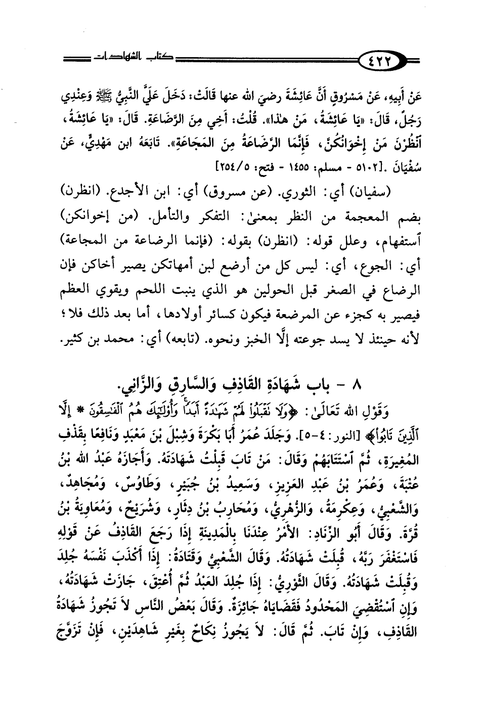 وَقَوْلِ اللَّهِ تَعَالى: {وَلَا تَقْبَلُوا لَهُمْ شَهَادَةً أَبَدًا، وَأُولَئِكَ هُمُ الفَاسِقُونَ إلا الَّذِينَ تَابُوا} [النور: 4 - 5]. وَجَلَدَ عُمَرُ، أَبَا بَكْرَةَ، وَشِبْلَ بْنَ مَعْبَدٍ، وَنَافِعًا بِقَذْفِ المُغِيرَةِ، ثُمَّ اسْتَتَابَهُمْ، وَقَال: "مَنْ تَابَ قَبِلْتُ شَهَادَتَهُ" وَأَجَازَهُ عَبْدُ اللَّهِ بْنُ عُتْبَةَ، وَعُمَرُ بْنُ عَبْدِ العَزِيزِ، وَسَعِيدُ بْنُ جُبَيْرٍ، وَطَاوُسٌ، وَمُجَاهِدٌ، وَالشَّعْبِيُّ، وَعِكْرِمَةُ، وَالزُّهْرِيُّ، وَمُحَارِبُ بْنُ دِثَارٍ، وَشُرَيْحٌ، وَمُعَاويَةُ بْنُ قُرَّةَ وَقَال أَبُو الزِّنَادِ: "الأَمْرُ عِنْدَنَا بِالْمَدِينَةِ إِذَا رَجَعَ القَاذِفُ عَنْ قَوْلِهِ، فَاسْتَغْفَرَ رَبَّهُ، قُبِلَتْ شَهَادَتُهُ" وَقَال الشَّعْبِيُّ، وَقَتَادَةُ: "إِذَا أَكْذَبَ نَفْسَهُ جُلِدَ، وَقُبِلَتْ شَهَادَتُهُ" وَقَال الثَّوْرِيُّ: "إِذَا جُلِدَ العَبْدُ ثُمَّ أُعْتِقَ جَازَتْ شَهَادَتُهُ، وَإِنِ اسْتُقْضِيَ المَحْدُودُ فَقَضَايَاهُ جَائِزَةٌ وَقَال بَعْضُ النَّاسِ: "لَا تَجُوزُ شَهَادَةُ القَاذِفِ وَإِنْ تَابَ، ثُمَّ قَال: لَا يَجُوزُ نِكَاحٌ بِغَيْرِ شَاهِدَيْنِ، فَإِنْ تَزَوَّجَ
