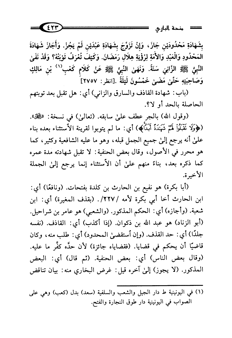 بِشَهَادَةِ مَحْدُودَيْنِ جَازَ، وَإِنْ تَزَوَّجَ بِشَهَادَةِ عَبْدَيْنِ لَمْ يَجُزْ، وَأَجَازَ شَهَادَةَ المَحْدُودِ وَالعَبْدِ وَالأَمَةِ لِرُؤْيَةِ هِلالِ رَمَضَانَ "وَكَيْفَ تُعْرَفُ تَوْبَتُهُ" وَقَدْ نَفَى النَّبِيُّ صَلَّى اللهُ عَلَيْهِ وَسَلَّمَ الزَّانِيَ سَنَةً وَنَهَى النَّبِيُّ صَلَّى اللهُ عَلَيْهِ وَسَلَّمَ عَنْ: كَلامِ كعب (¬1) بْنِ مَالِكٍ وَصَاحِبَيْهِ حَتَّى مَضَى خَمْسُونَ لَيْلَةً.