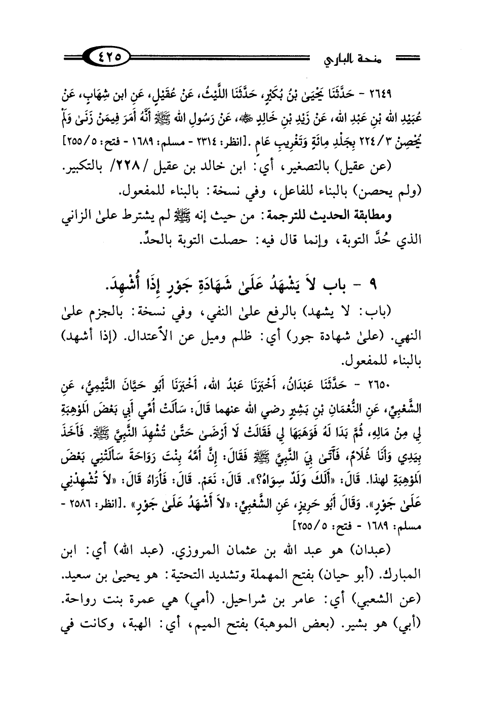 (عبدان) هو عبد الله بن عثمان المروزي. (عبد الله) أي: ابن المبارك. (أبو حيان) بفتح المهملة وتشديد التحتية: هو يحيى بن سعيد. (عن الشعبي) أي: عامر بن شراحيل. (أمي) هي عمرة بنت رواحة. (أبي) هو بشير. (بعض الموهبة) بفتح الميم، أي: الهبة، وكانت في