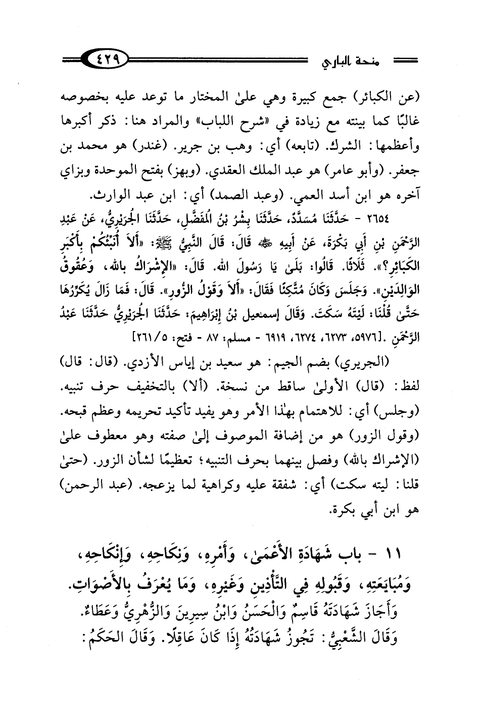 2654 - حَدَّثَنَا مُسَدَّدٌ، حَدَّثَنَا بِشْرُ بْنُ المُفَضَّلِ، حَدَّثَنَا الجُرَيْرِيُّ، عَنْ عَبْدِ الرَّحْمَنِ بْنِ أَبِي بَكْرَةَ، عَنْ أَبِيهِ رَضِيَ اللَّهُ عَنْهُ، قَال: قَال النَّبِيُّ صَلَّى اللهُ عَلَيْهِ وَسَلَّمَ: "أَلا أُنَبِّئُكُمْ بِأَكْبَرِ الكَبَائِرِ؟ " ثَلاثًا، قَالُوا: بَلَى يَا رَسُولَ اللَّهِ، قَال: "الإِشْرَاكُ بِاللَّهِ، وَعُقُوقُ الوَالِدَيْنِ - وَجَلَسَ وَكَانَ مُتَّكِئًا فَقَال - أَلا وَقَوْلُ الزُّورِ"، قَال: فَمَا زَال يُكَرِّرُهَا حَتَّى قُلْنَا: لَيْتَهُ سَكَتَ وَقَال إِسْمَاعِيلُ بْنُ إِبْرَاهِيمَ: حَدَّثَنَا الجُرَيْرِيُّ، حَدَّثَنَا عَبْدُ الرَّحْمَنِ.