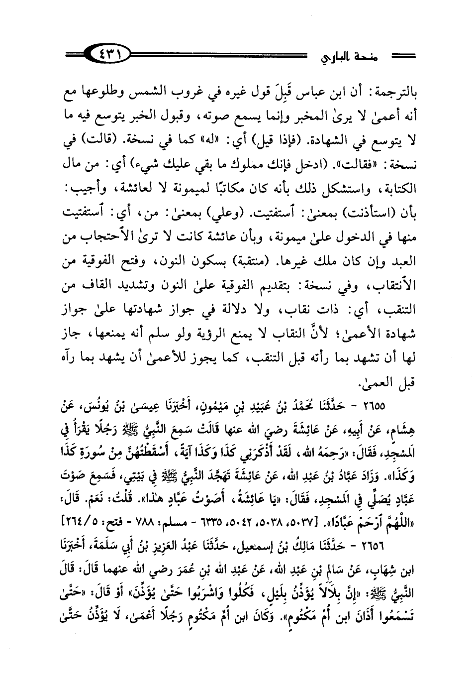 بالترجمة: أن ابن عباس قَبِلَ قول غيره في غروب الشمس وطلوعها مع أنه أعمى لا يرى المخبر وإنما يسمع صوته، وقبول الخبر يتوسع فيه ما لا يتوسع في الشهادة. (فإذا قيل) أي: "له" كما في نسخة. (قالت) في نسخة: "فقالت". (ادخل فإنك مملوك ما بقي عليك شيء) أي: من مال الكتابة، واستشكل ذلك بأنه كان مكاتبًا لميمونة لا لعائشة، وأجيب: بأن (استأذنت) بمعنى: استفتيت. (وعلي) بمعنى: من، أي: استفتيت منها في الدخول على ميمونة، وبأن عائشة كانت لا ترى الاحتجاب من العبد وإن كان ملك غيرها. (منتقبة) بسكون النون، وفتح الفوقية من الانتقاب، وفي نسخة: بتقديم الفوقية على النون وتشديد القاف من التنقب، أي: ذات نقاب، ولا دلالة في جواز شهادتها على جواز شهادة الأعمى، لأنَّ النقاب لا يمنع الرؤية ولو سلم أنه يمنعها، جاز لها أن تشهد بما رأته قبل التنقب، كما يجوز للأعمى أن يشهد بما رآه قبل العم.