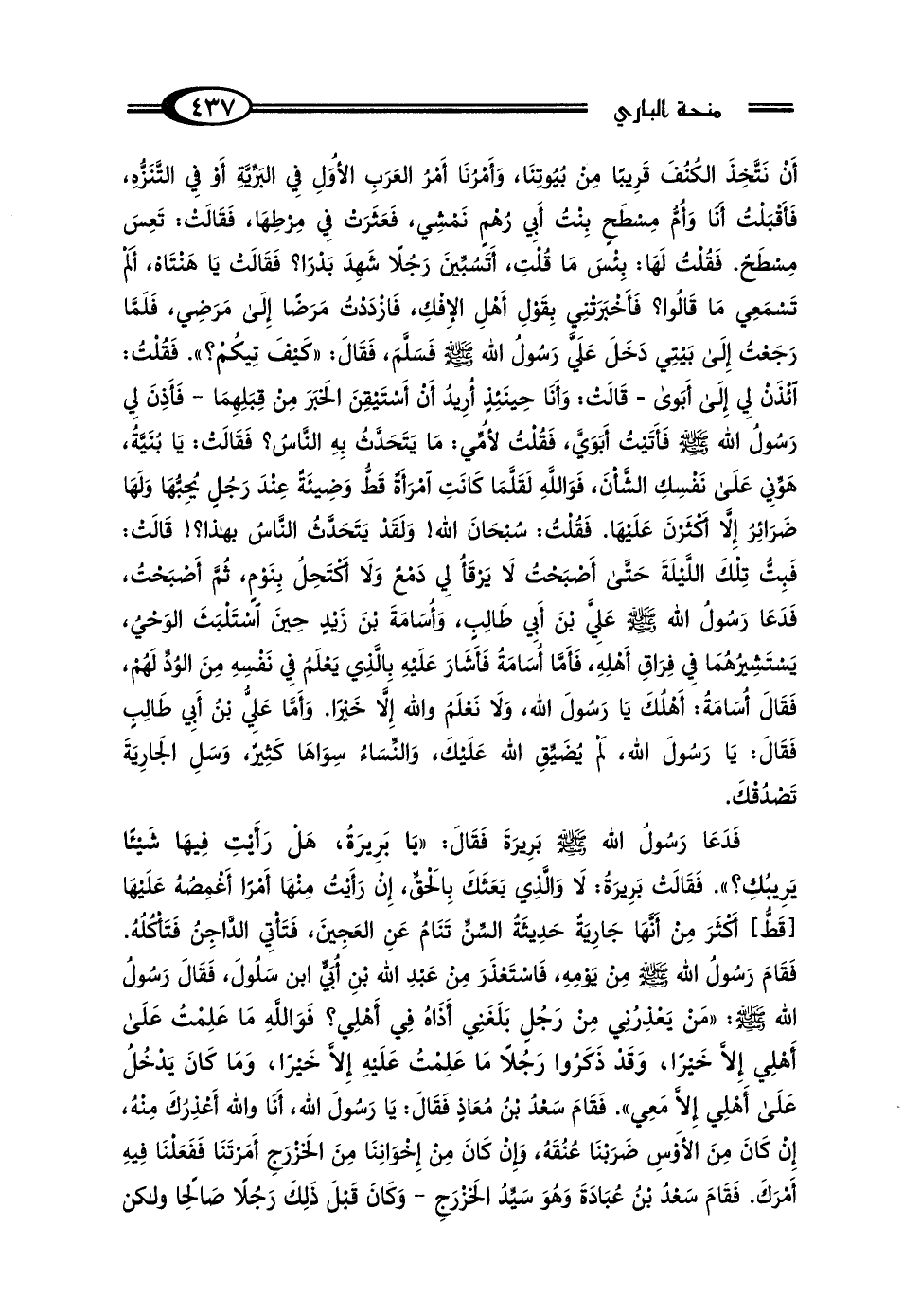 أَنْ نَتَّخِذَ الكُنُفَ قَرِيبًا مِنْ بُيُوتِنَا، وَأَمْرُنَا أَمْرُ العَرَبِ الأُوَلِ فِي البَرِّيَّةِ أَوْ فِي التَّنَزُّهِ، فَأَقْبَلْتُ أَنَا وَأُمُّ مِسْطَحٍ بِنْتُ أَبِي رُهْمٍ نَمْشِي، فَعَثَرَتْ فِي مِرْطِهَا، فَقَالتْ: تَعِسَ مِسْطَحٌ، فَقُلْتُ لَهَا: بِئْسَ مَا قُلْتِ، أَتَسُبِّينَ رَجُلًا شَهِدَ بَدْرًا، فَقَالتْ: يَا هَنْتَاهْ، أَلَمْ تَسْمَعِي مَا قَالُوا؟ فَأَخْبَرَتْنِي بِقَوْلِ أَهْلِ الإِفْكِ، فَازْدَدْتُ مَرَضًا عَلَى مَرَضِي، فَلَمَّا رَجَعْتُ إِلَى بَيْتِي دَخَلَ عَلَيَّ رَسُولُ اللَّهِ صَلَّى اللهُ عَلَيْهِ وَسَلَّمَ، فَسَلَّمَ فَقَال: "كَيْفَ تِيكُمْ"، فَقُلْتُ: ائْذَنْ لِي إِلَى أَبَوَيَّ، قَالتْ: وَأَنَا حِينَئِذٍ أُرِيدُ أَنْ أَسْتَيْقِنَ الخَبَرَ مِنْ قِبَلِهِمَا، فَأَذِنَ لِي رَسُولُ اللَّهِ صَلَّى اللهُ عَلَيْهِ وَسَلَّمَ، فَأَتَيْتُ أَبَوَيَّ فَقُلْتُ لِأُمِّي: مَا يَتَحَدَّثُ بِهِ النَّاسُ؟ فَقَالتْ: يَا بُنَيَّةُ هَوِّنِي عَلَى نَفْسِكِ الشَّأْنَ، فَوَاللَّهِ لَقَلَّمَا كَانَتِ امْرَأَةٌ قَطُّ وَضِيئَةٌ عِنْدَ رَجُلٍ يُحِبُّهَا وَلَهَا ضَرَائِرُ، إلا أَكْثَرْنَ عَلَيْهَا، فَقُلْتُ: سُبْحَانَ اللَّهِ، وَلَقَدْ يَتَحَدَّثُ النَّاسُ بِهَذَا، قَالتْ: فَبِتُّ تِلْكَ اللَّيْلَةَ حَتَّى أَصْبَحْتُ لَا يَرْقَأُ لِي دَمْعٌ، وَلَا أَكْتَحِلُ بِنَوْمٍ، ثُمَّ أَصْبَحْتُ، فَدَعَا رَسُولُ اللَّهِ صَلَّى اللهُ عَلَيْهِ وَسَلَّمَ عَلِيَّ بْنَ أَبِي طَالِبٍ، وَأُسَامَةَ بْنَ زَيْدٍ حِينَ اسْتَلْبَثَ الوَحْيُ، يَسْتَشِيرُهُمَا فِي فِرَاقِ أَهْلِهِ، فَأَمَّا أُسَامَةُ، فَأَشَارَ عَلَيْهِ بِالَّذِي يَعْلَمُ فِي نَفْسِهِ مِنَ الوُدِّ لَهُمْ، فَقَال أُسَامَةُ: أَهْلُكَ يَا رَسُولَ اللَّهِ، وَلَا نَعْلَمُ وَاللَّهِ إلا خَيْرًا، وَأَمَّا عَلِيُّ بْنُ أَبِي طَالِبٍ فَقَال: يَا رَسُولَ اللَّهِ، لَمْ يُضَيِّقِ اللَّهُ عَلَيْكَ، وَالنِّسَاءُ سِوَاهَا كَثِيرٌ، وَسَلِ الجَارِيَةَ تَصْدُقْكَ، فَدَعَا رَسُولُ اللَّهِ صَلَّى اللهُ عَلَيْهِ وَسَلَّمَ بَرِيرَةَ، فَقَال: "يَا بَرِيرَةُ هَلْ رَأَيْتِ فِيهَا شَيْئًا يَرِيبُكِ؟ "، فَقَالتْ بَرِيرَةُ: لَا وَالَّذِي بَعَثَكَ بِالحَقِّ، إِنْ رَأَيْتُ مِنْهَا أَمْرًا أَغْمِصُهُ عَلَيْهَا قَطُّ، أَكْثَرَ مِنْ أَنَّهَا جَارِيَةٌ حَدِيثَةُ السِّنِّ، تَنَامُ عَنِ العَجِينِ، فَتَأْتِي الدَّاجِنُ فَتَأْكُلُهُ، فَقَامَ رَسُولُ اللَّهِ صَلَّى اللهُ عَلَيْهِ وَسَلَّمَ مِنْ يَوْمِهِ، فَاسْتَعْذَرَ مِنْ عَبْدِ اللَّهِ بْنِ أُبَيٍّ ابْنِ سَلُولَ، فَقَال رَسُولُ اللَّهِ صَلَّى اللهُ عَلَيْهِ وَسَلَّمَ: "مَنْ يَعْذُرُنِي مِنْ رَجُلٍ بَلَغَنِي أَذَاهُ فِي أَهْلِي، فَوَاللَّهِ مَا عَلِمْتُ عَلَى أَهْلِي إلا خَيْرًا، وَقَدْ ذَكَرُوا رَجُلًا مَا عَلِمْتُ عَلَيْهِ إلا خَيْرًا، وَمَا كَانَ يَدْخُلُ عَلَى أَهْلِي إلا مَعِي"، فَقَامَ سَعْدُ بْنُ مُعَاذٍ، فَقَال: يَا رَسُولَ اللَّهِ، أَنَا وَاللَّهِ أَعْذُرُكَ مِنْهُ إِنْ كَانَ مِنَ الأَوْسِ ضَرَبْنَا عُنُقَهُ، وَإِنْ كَانَ مِنْ إِخْوَانِنَا مِنَ الخَزْرَجِ أَمَرْتَنَا، فَفَعَلْنَا فِيهِ أَمْرَكَ، فَقَامَ سَعْدُ بْنُ عُبَادَةَ - وَهُوَ سَيِّدُ الخَزْرَجِ، وَكَانَ قَبْلَ ذَلِكَ رَجُلًا صَالِحًا وَلَكِنِ
