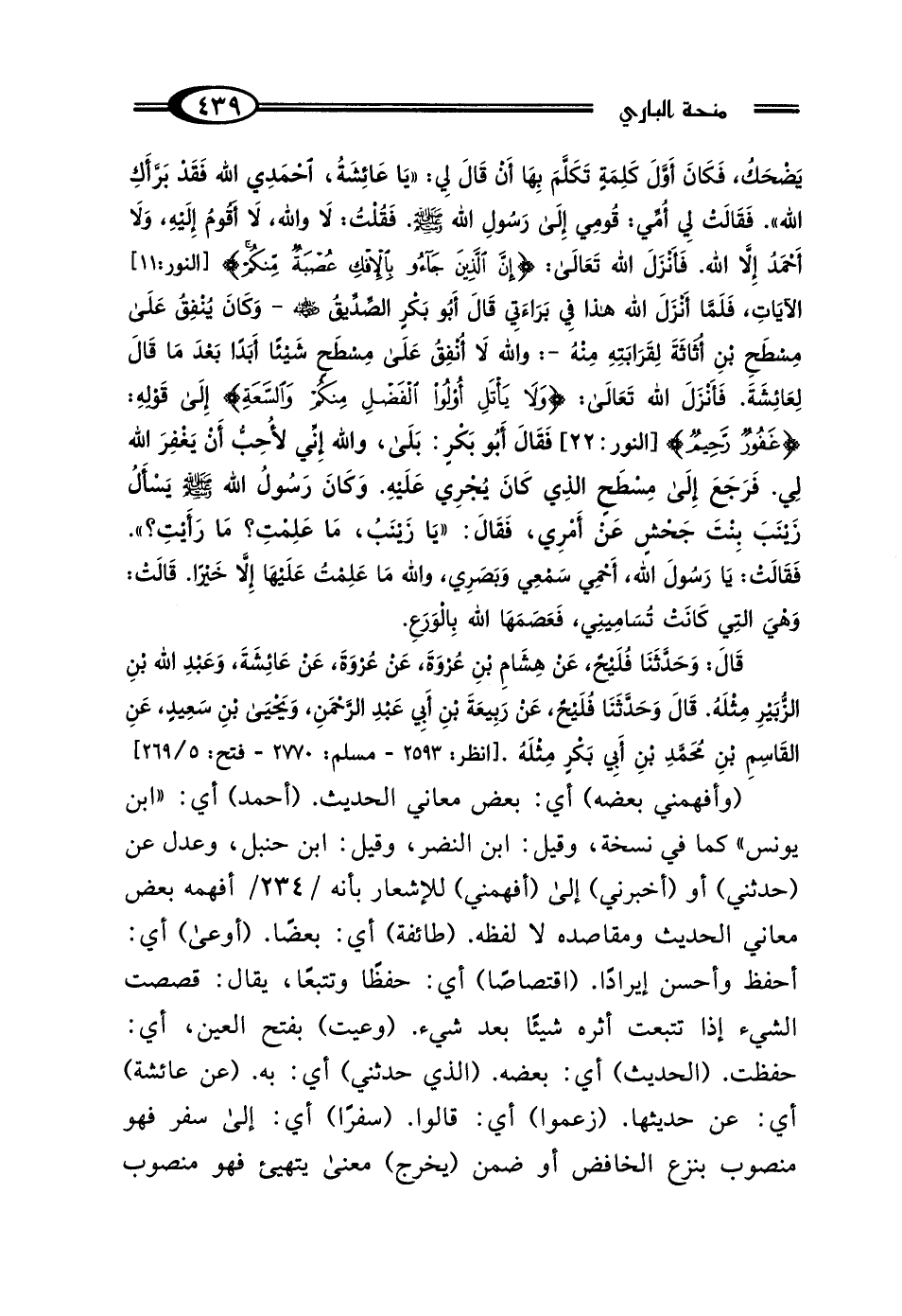 يَضْحَكُ، فَكَانَ أَوَّلَ كَلِمَةٍ تَكَلَّمَ بِهَا، أَنْ قَال لِي: "يَا عَائِشَةُ احْمَدِي اللَّهَ، فَقَدْ بَرَّأَكِ اللَّهُ"، فَقَالتْ لِي أُمِّي: قُومِي إِلَى رَسُولِ اللَّهِ صَلَّى اللهُ عَلَيْهِ وَسَلَّمَ، فَقُلْتُ: لَا وَاللَّهِ، لَا أَقُومُ إِلَيْهِ، وَلَا أَحْمَدُ إلا اللَّهَ، فَأَنْزَلَ اللَّهُ تَعَالى: {إِنَّ الَّذِينَ جَاءُوا بِالإِفْكِ عُصْبَةٌ مِنْكُمْ} الآيَاتِ، فَلَمَّا أَنْزَلَ اللَّهُ هَذَا فِي بَرَاءَتِي، قَال أَبُو بَكْرٍ الصِّدِّيقُ رَضِيَ اللَّهُ عَنْهُ وَكَانَ يُنْفِقُ عَلَى مِسْطَحِ بْنِ أُثَاثَةَ لِقَرَابَتِهِ مِنْهُ: وَاللَّهِ لَا أُنْفِقُ عَلَى مِسْطَحٍ شَيْئًا أَبَدًا بَعْدَ مَا قَال لِعَائِشَةَ، فَأَنْزَلَ اللَّهُ تَعَالى: {وَلَا يَأْتَلِ أُولُو الفَضْلِ مِنْكُمْ وَالسَّعَةِ أَنْ يُؤْتُوا} إِلَى قَوْلِهِ {غَفُورٌ رَحِيمٌ} [البقرة: 173] فَقَال أَبُو بَكْرٍ: بَلَى وَاللَّهِ إِنِّي لَأُحِبُّ أَنْ يَغْفِرَ اللَّهُ لِي، فَرَجَعَ إِلَى مِسْطَحٍ الَّذِي كَانَ يُجْرِي عَلَيْهِ، وَكَانَ رَسُولُ اللَّهِ صَلَّى اللهُ عَلَيْهِ وَسَلَّمَ يَسْأَلُ زَيْنَبَ بِنْتَ جَحْشٍ عَنْ أَمْرِي، فَقَال: "يَا زَيْنَبُ، مَا عَلِمْتِ مَا رَأَيْتِ"، فَقَالتْ: يَا رَسُولَ اللَّهِ، أَحْمِي سَمْعِي وَبَصَرِي، وَاللَّهِ مَا عَلِمْتُ عَلَيْهَا إلا خَيْرًا، قَالتْ: وَهِيَ الَّتِي كَانَتْ تُسَامِينِي، فَعَصَمَهَا اللَّهُ بِالوَرَعِ قَال: وَحَدَّثَنَا فُلَيْحٌ، عَنْ هِشَامِ بْنِ عُرْوَةَ، عَنْ عُرْوَةَ، عَنْ عَائِشَةَ، وَعَبْدِ اللَّهِ بْنِ الزُّبَيْرِ مِثْلَهُ، قَال: وَحَدَّثَنَا فُلَيْحٌ، عَنْ رَبِيعَةَ بْنِ أَبِي عَبْدِ الرَّحْمَنِ، وَيَحْيَى بْنِ سَعِيدٍ، عَنِ القَاسِمِ بْنِ مُحَمَّدِ بْنِ أَبِي بَكْرٍ مِثْلَهُ.
