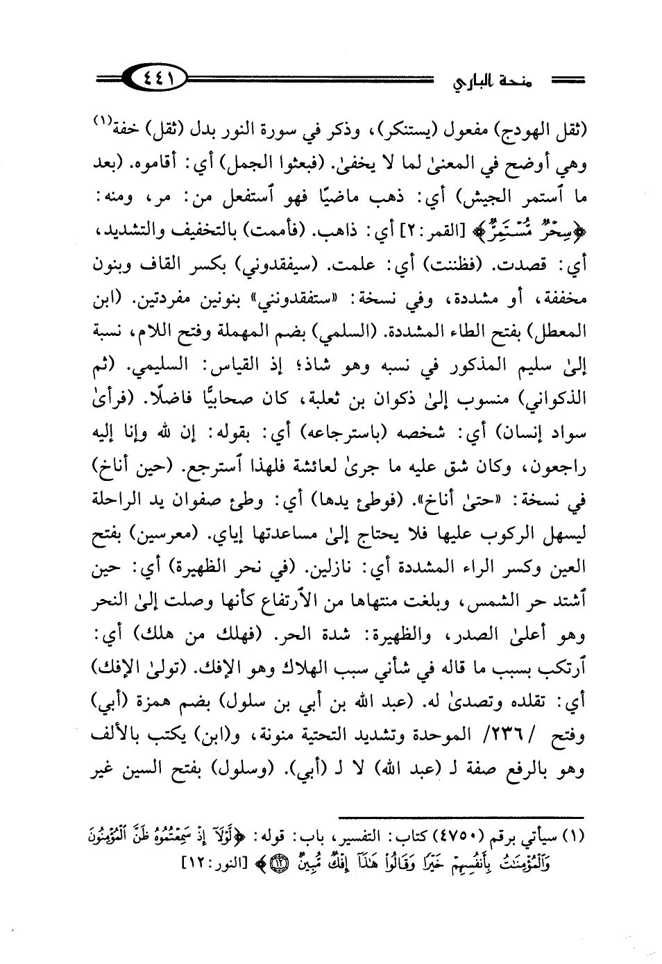 (ثقل الهودج) مفعول (يستنكر)، وذكر في سورة النور بدل (ثقل) خفة (¬1) وهي أوضح في المعنى لما لا يخفى. (فبعثوا الجمل) أي: أقاموه. (بعد ما استمر الجيش) أي: ذهب ماضيًا فهو استفعل من: مر، ومنه: {سِحْرٌ مُسْتَمِرٌّ} [القمر: 2] أي: ذاهب. (فأممت) بالتخفيف والتشديد، أي: قصدت. (فظننت) أي: علمت. (سيفقدوني) بكسر القاف وبنون مخففة، أو مشددة، وفي نسخة: "ستفقدونني" بنونين مفردتين. (ابن المعطل) بفتح الطاء المشددة. (السلمي) بضم المهملة وفتح اللام، نسبة إلى سليم المذكور في نسبه وهو شاذ؛ إذ القياس: السليمي. (ثم الذكواني) منسوب إلى ذكوان بن ثعلبة، كان صحابيًّا فاضلًا. (فرأى سواد إنسان) أي: شخصه (باسترجاعه) أي: بقوله: إن لله وإنا إليه راجعون، وكان شق عليه ما جرى لعائشة فلهذا استرجع. (حين أناخ) في نسخة: "حتى أناخ". (فوطئ يدها) أي: وطئ صفوان يد الراحلة ليسهل الركوب عليها فلا يحتاج إلى مساعدتها إياي. (معرسين) بفتح العين وكسر الراء المشددة أي: نازلين. (في نحر الظهيرة) أي: حين اشتد حر الشمس، وبلغت منتهاها من الارتفاع كأنها وصلت إلى النحر وهو أعلى الصدر، والظهيرة: شدة الحر. (فهلك من هلك) أي: ارتكب بسبب ما قاله في شأني سبب الهلاك وهو الإفك. (تولى الإفك) أي: تقلده وتصدى له. (عبد الله بن أبي بن سلول) بضم همزة (أبي) وفتح الموحدة وتشديد التحتية منونة، و (ابن) يكتب بالألف وهو بالرفع صفة لـ (عبد الله) لا لـ (أبي). (وسلول) بفتح السين غير