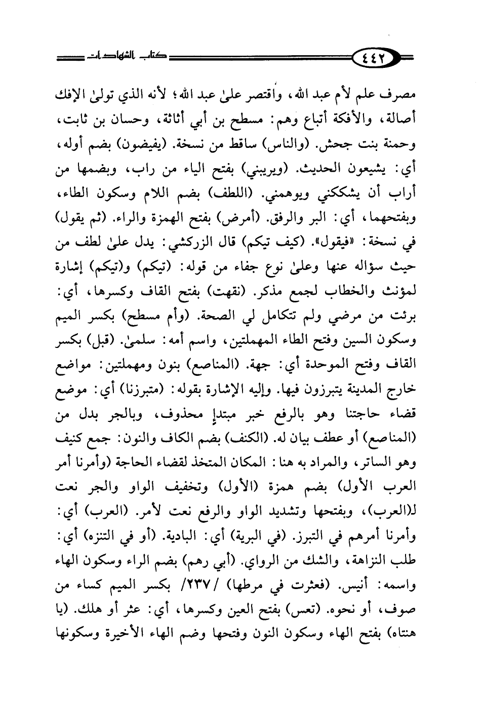 مصرف علم لأم عبد الله، واقتصر على عبد الله؛ لأنه الذي تولى الإفك أصالة، والأفكة أتباع وهم: مسطح بن أبي أثاثة، وحسان بن ثابت، وحمنة بنت جحش. (والناس) ساقط من نسخة. (يفيضون) بضم أوله، أي: يشيعون الحديث. (ويريبني) بفتح الياء من راب، وبضمها من أراب أن يشككني ويوهمني. (اللطف) بضم اللام وسكون الطاء، وبفتحهما، أي: البر والرفق. (أمرض) بفتح الهمزة والراء. (ثم يقول) في نسخة: "فيقول". (كيف تيكم) قال الزركشي: يدل على لطف من حيث سؤاله عنها وعلى نوع جفاء من قوله: (تيكم) و (تيكم) إشارة لمؤنث والخطاب لجمع مذكر. (نقهت) بفتح القاف وكسرها، أي: برئت من مرضي ولم تتكامل لي الصحة. (وأم مسطح) بكسر الميم وسكون السين وفتح الطاء المهملتين، واسم أمه: سلمى. (قبل) بكسر القاف وفتح الموحدة أي: جهة. (المناصع) بنون ومهملتين: مواضع خارج المدينة يتبرزون فيها. وإليه الإشارة بقوله: (متبرزنا) أي: موضع قضاء حاجتنا وهو بالرفع خبر مبتدإٍ محذوف، وبالجر بدل من (المناصع) أو عطف بيان له. (الكنف) بضم الكاف والنون: جمع كنيف وهو الساتر، والمراد به هنا: المكان المتخذ لقضاء الحاجة (وأمرنا أمر العرب الأول) بضم همزة (الأول) وتخفيف الواو والجر نعت لـ (العرب)، وبفتحها وتشديد الواو والرفع نعت لأمر. (العرب) أي: وأمرنا أمرهم في التبرز. (في البرية) أي: البادية. (أو في التنزه) أي: طلب النزاهة، والشك من الرواي. (أبي رهم) بضم الراء وسكون الهاء واسمه: أنيس. (فعثرت في مرطها) بكسر الميم كساء من صوف، أو نحوه. (تعس) بفتح العين وكسرها، أي: عثر أو هلك. (يا هنتاه) بفتح الهاء وسكون النون وفتحها وضم الهاء الأخيرة وسكونها