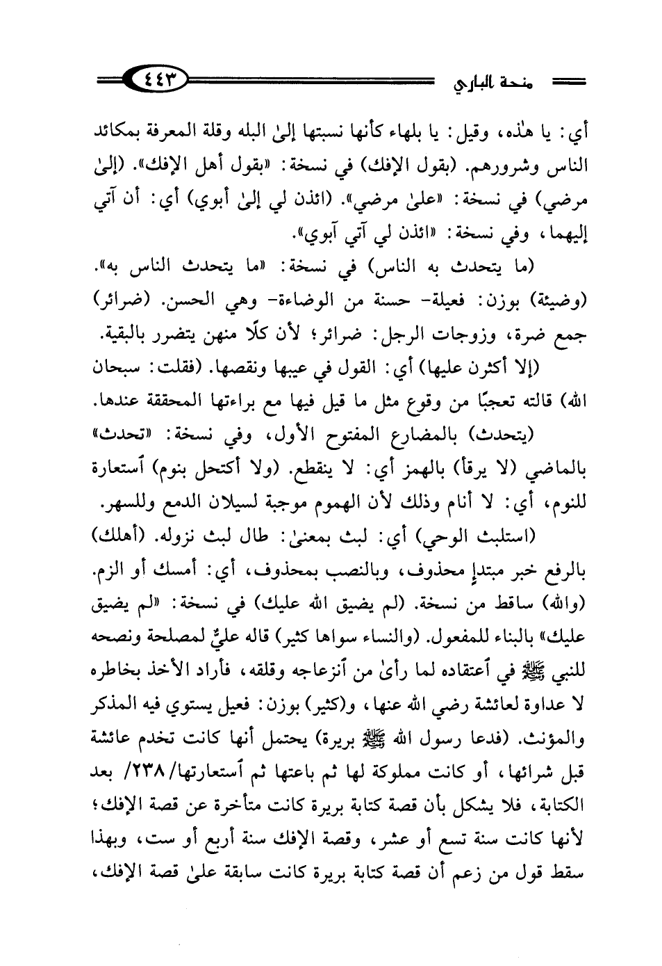 (استلبث الوحي) أي: لبث بمعنى: طال لبث نزوله. (أهلك) بالرفع خبر مبتدإٍ محذوف، وبالنصب بمحذوف، أي: أمسك أو الزم. (والله) ساقط من نسخة. (لم يضيق الله عليك) في نسخة: "لم يضيق عليك" بالبناء للمفعول. (والنساء سواها كثير) قاله عليٌّ لمصلحة ونصحه للنبي - صلى الله عليه وسلم - في اعتقاده لما رأى من انزعاجه وقلقه، فأراد الأخذ بخاطره لا عداوة لعائشة رضي الله عنها، و (كثير) بوزن: فعيل يستوي فيه المذكر والمؤنث. (فدعا رسول الله - صلى الله عليه وسلم - بريرة) يحتمل أنها كانت تخدم عائشة قبل شرائها، أو كانت مملوكة لها ثم باعتها ثم استعارته بعد الكتابة، فلا يشكل بأن قصة كتابة بريرة كانت متأخرة عن قصة الإفك؛ لأنها كانت سنة تسع أو عشر، وقصة الإفك سنة أربع أو ست، وبهذا سقط قول من زعم أن قصة كتابة بريرة كانت سابقة على قصة الإفك،