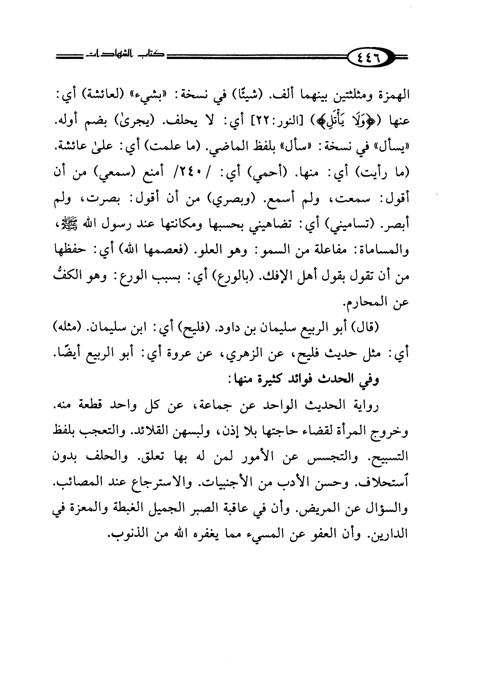 الهمزة ومثلثتين بينهما ألف. (شيئًا) في نسخة: "بشيء" (لعائشة) أي: عنها ({وَلَا يَأْتَلِ}) [النور: 22] أي: لا يحلف. (يجرى) بضم أوله. "يسأل" في نسخة: "سأل" بلفظ الماضي. (ما علمت) أي: على عائشة. (ما رأيت) أي: منها. (أحمي) أي: أمنع (سمعي) من أن أقول: سمعت، ولم أسمع. (وبصري) من أن أقول: بصرت، ولم أبصر. (تساميني) أي: تضاهيني بحسبها ومكانتها عند رسول الله - صلى الله عليه وسلم -، والمساماة: مفاعلة من السمو: وهو العلو. (فعصمها الله) أي: حفظها من أن تقول بقول أهل الإفك. (بالورع) أي: بسبب الورع: وهو الكفُّ عن المحارم.