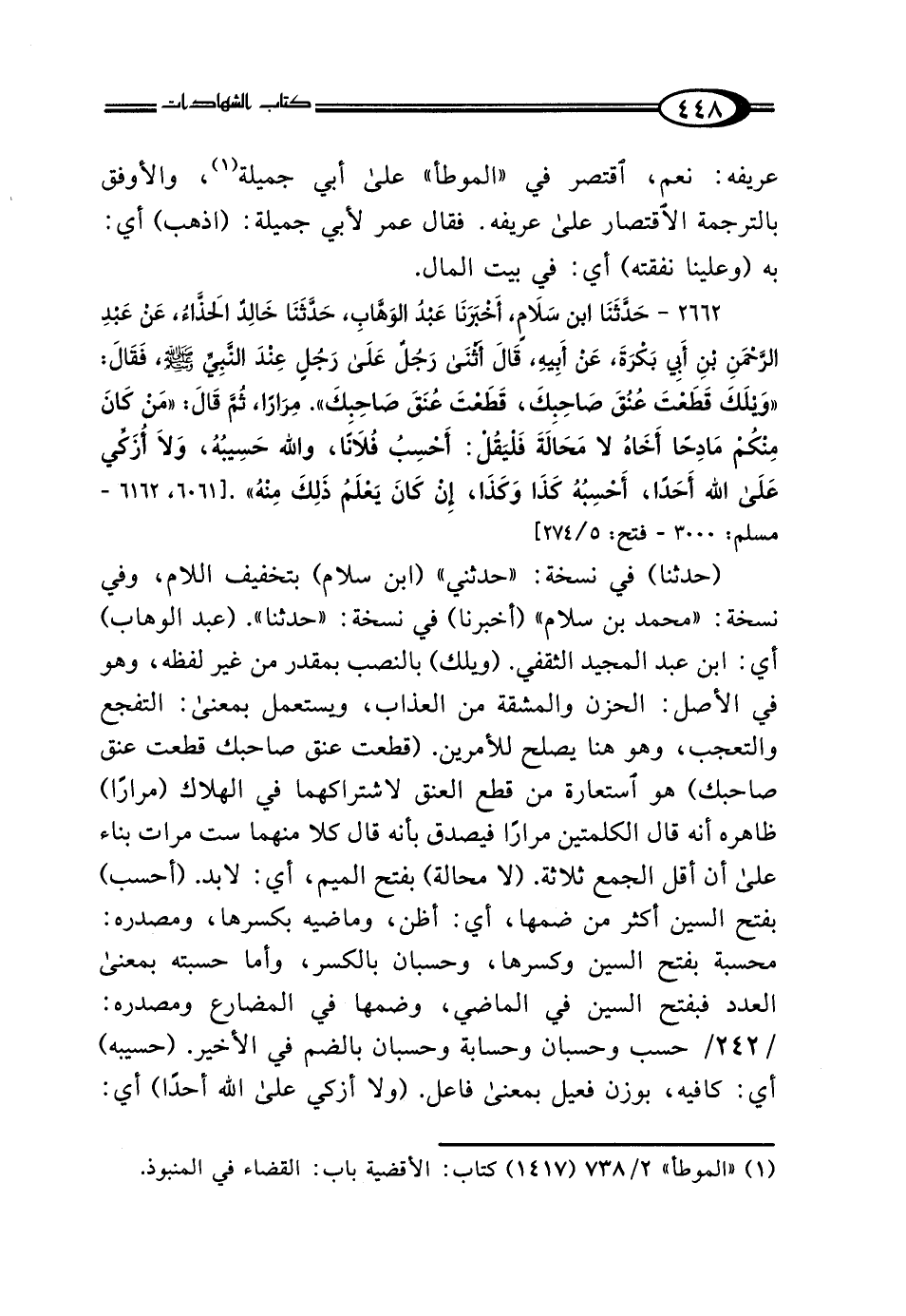 (حدثنا) في نسخة: "حدثني" (ابن سلام) بتخفيف اللام، وفي نسخة: "محمد بن سلام" (أخبرنا) في نسخة: "حدثنا". (عبد الوهاب) أي: ابن عبد المجيد الثقفي. (ويلك) بالنصب بمقدر من غير لفظه، وهو في الأصل: الحزن والمشقة من العذاب، ويستعمل بمعنى: التفجع والتعجب، وهو هنا يصلح للأمرين. (قطعت عنق صاحبك قطعت عنق صاحبك) هو استعارة من قطع العنق لاشتراكهما في الهلاك (مرارًا) ظاهره أنه قال الكلمتين مرارًا فيصدق بأنه قال كلا منهما ست مرات بناء على أن أقل الجمع ثلاثة. (لا محالة) بفتح الميم، أي: لا بد. (أحسب) بفتح السين أكثر من ضمها، أي: أظن، وماضيه بكسرها، ومصدره: محسبة بفتح السين وكسرها، وحسبان بالكسر، وأما حسبته بمعنى العدد فبفتح السين في الماضي، وضمها في المضارع ومصدره: حسب وحسبان وحسابة وحسبان بالضم في الأخير. (حسيبه) أي: كافيه، بوزن فعيل بمعنى فاعل. (ولا أزكي على الله أحدًا) أي: