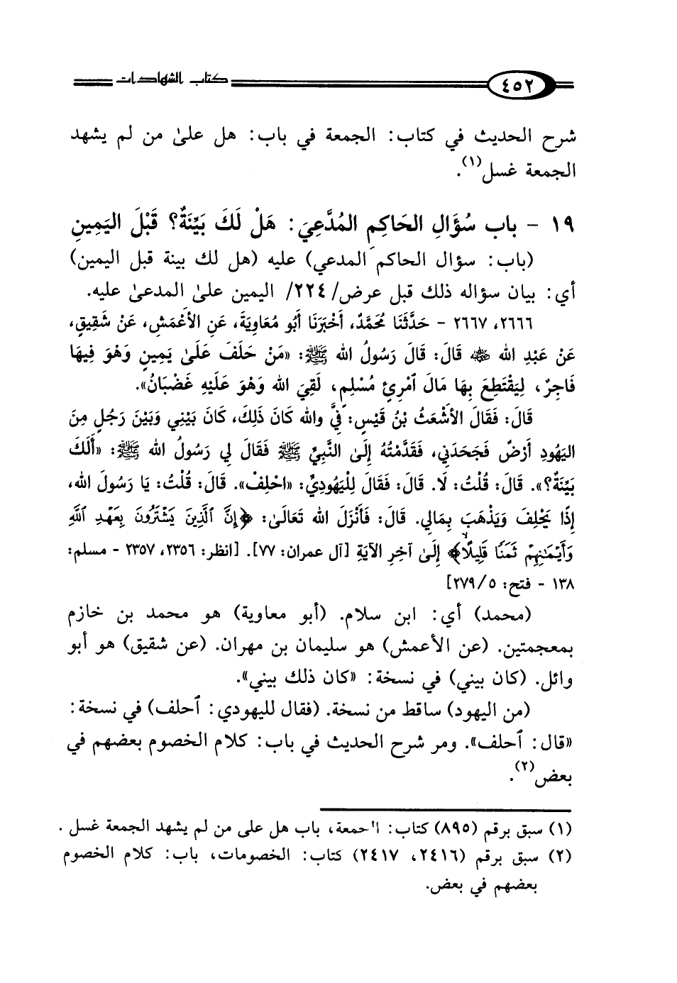 2666، 2667 - حَدَّثَنَا مُحَمَّدٌ، أَخْبَرَنَا أَبُو مُعَاويَةَ، عَنِ الأَعْمَشِ، عَنْ شَقِيقٍ، عَنْ عَبْدِ اللَّهِ رَضِيَ اللَّهُ عَنْهُ، قَال: قَال رَسُولُ اللَّهِ صَلَّى اللهُ عَلَيْهِ وَسَلَّمَ: "مَنْ حَلَفَ عَلَى يَمِينٍ وَهُوَ فِيهَا فَاجِرٌ، لِيَقْتَطِعَ بِهَا مَال امْرِئٍ مُسْلِمٍ، لَقِيَ اللَّهَ وَهُوَ عَلَيْهِ غَضْبَانُ"، قَال: فَقَال الأَشْعَثُ بْنُ قَيْسٍ: فِيَّ وَاللَّهِ كَانَ ذَلِكَ، كَانَ بَيْنِي وَبَيْنَ رَجُلٍ مِنَ اليَهُودِ أَرْضٌ، فَجَحَدَنِي، فَقَدَّمْتُهُ إِلَى النَّبِيِّ صَلَّى اللهُ عَلَيْهِ وَسَلَّمَ، فَقَال لِي رَسُولُ اللَّهِ صَلَّى اللهُ عَلَيْهِ وَسَلَّمَ: "أَلَكَ بَيِّنَةٌ"، قَال: قُلْتُ: لَا، قَال: فَقَال لِلْيَهُودِيِّ: "احْلِفْ"، قَال: قُلْتُ: يَا رَسُولَ اللَّهِ، إِذًا يَحْلِفَ وَيَذْهَبَ بِمَالِي، قَال: فَأَنْزَلَ اللَّهُ تَعَالى: {إِنَّ الَّذِينَ يَشْتَرُونَ بِعَهْدِ اللَّهِ وَأَيْمَانِهِمْ ثَمَنًا قَلِيلًا} [آل عمران: 77] إِلَى آخِرِ الآيَةِ.