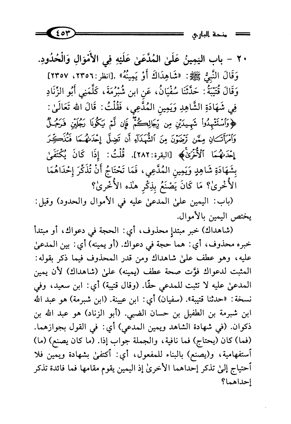 وَقَال قُتَيْبَةُ، حَدَّثَنَا سُفْيَانُ، عَنْ ابْنِ شُبْرُمَةَ، كَلَّمَنِي أَبُو الزِّنَادِ فِي شَهَادَةِ الشَّاهِدِ وَيَمِينِ المُدَّعِي، فَقُلْتُ: قَال اللَّهُ تَعَالى: (وَاسْتَشْهِدُوا شَهِيدَيْنِ مِنْ رِجَالِكُمْ فَإِنْ لَمْ يَكُونَا رَجُلَيْنِ فَرَجُلٌ وَامْرَأَتَانِ مِمَّنْ تَرْضَوْنَ مِنَ الشُّهَدَاءِ أَنْ تَضِلَّ إِحْدَاهُمَا فَتُذْكِرَ إِحْدَاهُمَا الأُخْرَى)، قُلْتُ: "إِذَا كَانَ يُكْتَفَى بِشَهَادَةِ شَاهِدٍ وَيَمِينِ المُدَّعِي، فَمَا تَحْتَاجُ أَنْ تُذْكِرَ إِحْدَاهُمَا الأُخْرَى مَا كَانَ يَصْنَعُ بِذِكْرِ هَذِهِ الأُخْرَى؟