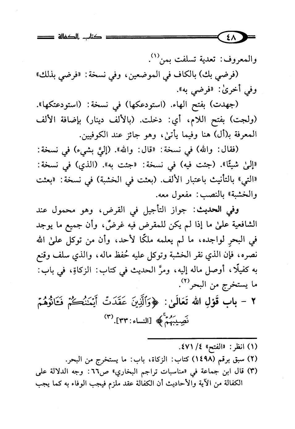 (¬3) قال ابن جماعة في "مناسبات تراجم البخاري" ص 66: وجه الدلالة على الكفالة من الآية والأحاديث أن الكفالة عقد ملزم فيجب الوفاء به كما يجب =