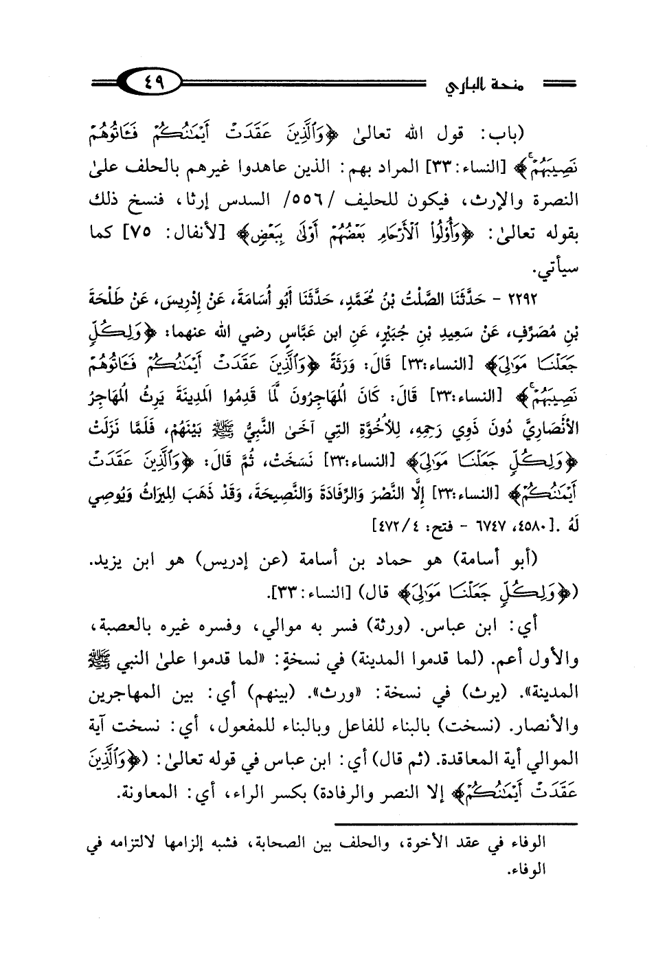 2292 - حَدَّثَنَا الصَّلْتُ بْنُ مُحَمَّدٍ، حَدَّثَنَا أَبُو أُسَامَةَ، عَنْ إِدْرِيسَ، عَنْ طَلْحَةَ بْنِ مُصَرِّفٍ، عَنْ سَعِيدِ بْنِ جُبَيْرٍ، عَنِ ابْنِ عَبَّاسٍ رَضِيَ اللَّهُ عَنْهُمَا: {وَلِكُلٍّ جَعَلْنَا مَوَالِيَ} [النساء: 33]، قَال: "وَرَثَةً": (وَالَّذِينَ عَاقَدَتْ أَيْمَانُكُمْ) قَال: "كَانَ المُهَاجِرُونَ لَمَّا قَدِمُوا المَدِينَةَ، يَرِثُ المُهَاجِرُ الأَنْصَارِيَّ دُونَ ذَوي رَحِمِهِ، لِلْأُخُوَّةِ الَّتِي آخَى النَّبِيُّ صَلَّى اللهُ عَلَيْهِ وَسَلَّمَ بَيْنَهُمْ، فَلَمَّا نَزَلَتْ: {وَلِكُلٍّ جَعَلْنَا مَوَالِيَ} [النساء: 33] نَسَخَتْ"، ثُمَّ قَال: (وَالَّذِينَ عَاقَدَتْ أَيْمَانُكُمْ) "إلا النَّصْرَ، وَالرِّفَادَةَ، وَالنَّصِيحَةَ، وَقَدْ ذَهَبَ المِيرَاثُ، وَيُوصِي لَهُ".