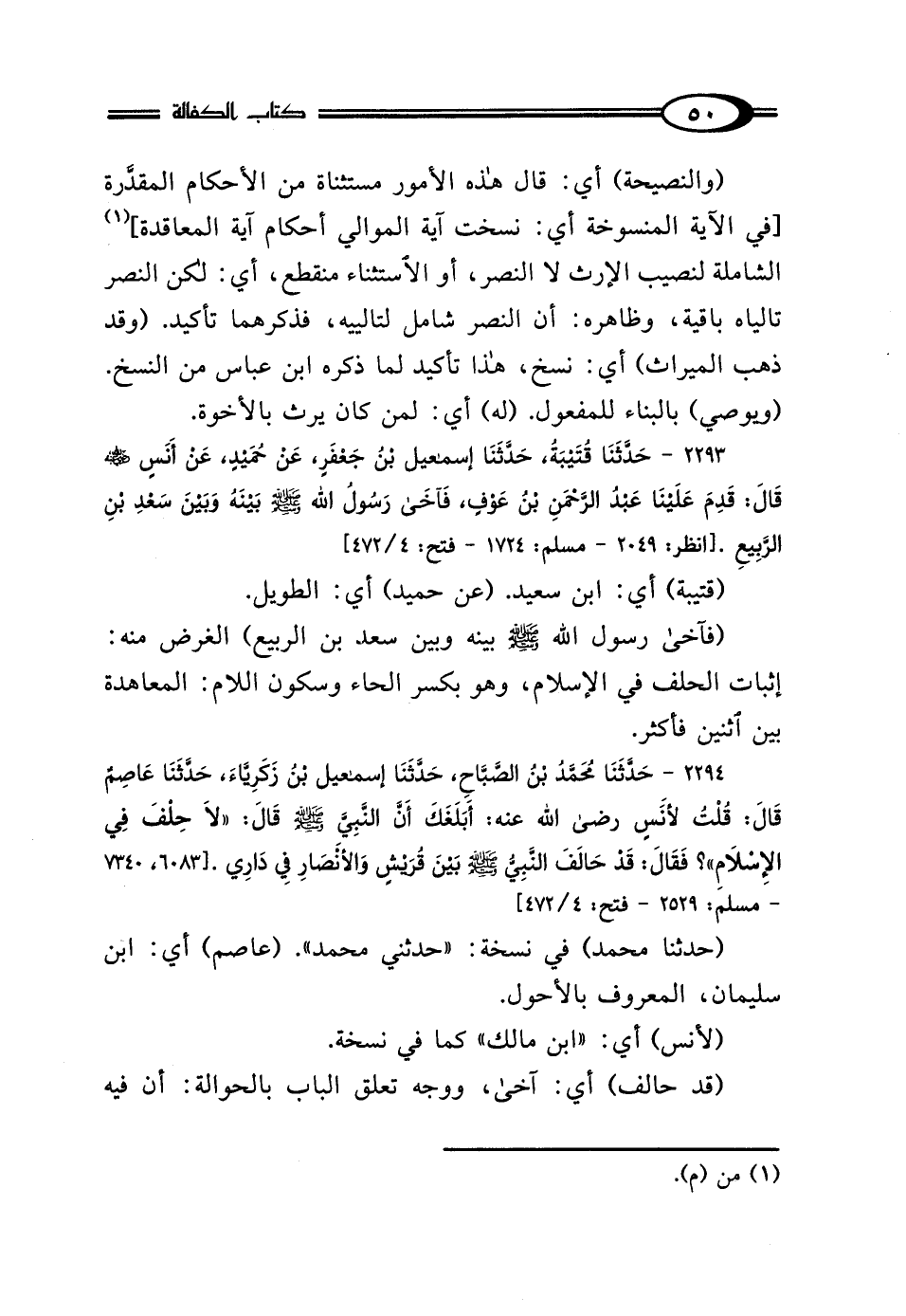 (والنصيحة) أي: قال هذه الأمور مستثناة من الأحكام المقدَّرة [في الآية المنسوخة أي: نسخت آية الموالي أحكام آية المعاقدة] (¬1) الشاملة لنصيب الإرث لا النصر، أو الاستثناء منقطع، أي: لكن النصر تالياه باقية، وظاهره: أن النصر شامل لتالييه، فذكرهما تأكيد. (وقد ذهب الميراث) أي: نسخ، هذا تأكيد لما ذكره ابن عباس من النسخ. (ويوصي) بالبناء للمفعول. (له) أي: لمن كان يرث بالأخوة.