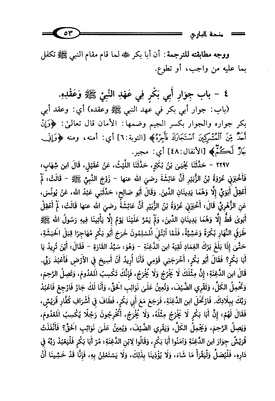 2297 - حَدَّثَنَا يَحْيَى بْنُ بُكَيْرٍ، حَدَّثَنَا اللَّيْثُ، عَنْ عُقَيْلٍ، قَال ابْنُ شِهَابٍ: فَأَخْبَرَنِي عُرْوَةُ بْنُ الزُّبَيْرِ، أَنَّ عَائِشَةَ رَضِيَ اللَّهُ عَنْهَا، زَوْجَ النَّبِيِّ صَلَّى اللهُ عَلَيْهِ وَسَلَّمَ، قَالتْ: لَمْ أَعْقِلْ أَبَوَيَّ قَطُّ إلا وَهُمَا يَدِينَانِ الدِّينَ، وَقَال أَبُو صَالِحٍ: حَدَّثَنِي عَبْدُ اللَّهِ، عَنْ يُونُسَ، عَنِ الزُّهْرِيِّ، قَال: أَخْبَرَنِي عُرْوَةُ بْنُ الزُّبَيْرِ، أَنَّ عَائِشَةَ رَضِيَ اللَّهُ عَنْهَا، قَالتْ: لَمْ أَعْقِلْ أَبَوَيَّ قَطُّ إلا وَهُمَا يَدِينَانِ الدِّينَ، وَلَمْ يَمُرَّ عَلَيْنَا يَوْمٌ إلا يَأْتِينَا فِيهِ رَسُولُ اللَّهِ صَلَّى اللهُ عَلَيْهِ وَسَلَّمَ طَرَفَيِ النَّهَارِ، بُكْرَةً وَعَشِيَّةً، فَلَمَّا ابْتُلِيَ المُسْلِمُونَ، خَرَجَ أَبُو بَكْرٍ مُهَاجِرًا قِبَلَ الحَبَشَةِ، حَتَّى إِذَا بَلَغَ بَرْكَ الغِمَادِ لَقِيَهُ ابْنُ الدَّغِنَةِ، وَهُوَ سَيِّدُ القَارَةِ، فَقَال: أَيْنَ تُرِيدُ يَا أَبَا بَكْرٍ؟ فَقَال أَبُو بَكْرٍ: أَخْرَجَنِي قَوْمِي، فَأَنَا أُرِيدُ أَنْ أَسِيحَ فِي الأَرْضِ، فَأَعْبُدَ رَبِّي، قَال ابْنُ الدَّغِنَةِ: إِنَّ مِثْلَكَ لَا يَخْرُجُ وَلَا يُخْرَجُ، فَإِنَّكَ تَكْسِبُ المَعْدُومَ، وَتَصِلُ الرَّحِمَ، وَتَحْمِلُ الكَلَّ، وَتَقْرِي الضَّيْفَ، وَتُعِينُ عَلَى نَوَائِبِ الحَقِّ، وَأَنَا لَكَ جَارٌ، فَارْجِعْ فَاعْبُدْ رَبَّكَ بِبِلادِكَ، فَارْتَحَلَ ابْنُ الدَّغِنَةِ، فَرَجَعَ مَعَ أَبِي بَكْرٍ، فَطَافَ فِي أَشْرَافِ كُفَّارِ قُرَيْشٍ، فَقَال لَهُمْ: إِنَّ أَبَا بَكْرٍ لَا يَخْرُجُ مِثْلُهُ وَلَا يُخْرَجُ، أَتُخْرِجُونَ رَجُلًا يُكْسِبُ المَعْدُومَ، وَيَصِلُ الرَّحِمَ، وَيَحْمِلُ الكَلَّ، وَيَقْرِي الضَّيْفَ، وَيُعِينُ عَلَى نَوَائِبِ الحَقِّ، فَأَنْفَذَتْ قُرَيْشٌ جِوَارَ ابْنِ الدَّغِنَةِ، وَآمَنُوا أَبَا بَكْرٍ، وَقَالُوا لِابْنِ الدَّغِنَةِ: مُرْ أَبَا بَكْرٍ، فَلْيَعْبُدْ رَبَّهُ فِي دَارِهِ، فَلْيُصَلِّ، وَلْيَقْرَأْ مَا شَاءَ، وَلَا يُؤْذِينَا بِذَلِكَ، وَلَا يَسْتَعْلِنْ بِهِ، فَإِنَّا قَدْ خَشِينَا أَنْ