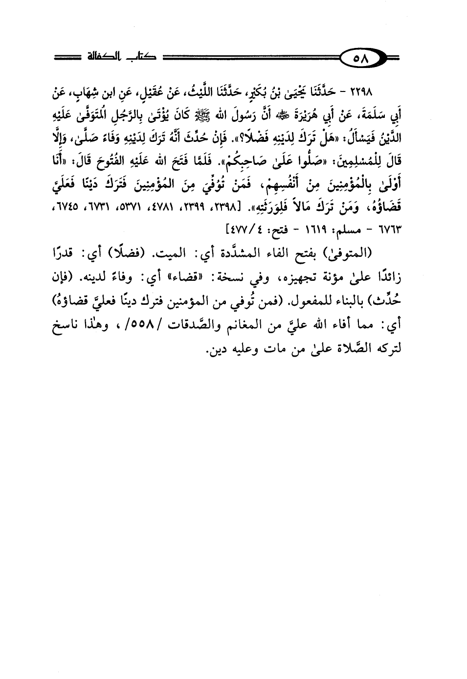 2298 - حَدَّثَنَا يَحْيَى بْنُ بُكَيْرٍ، حَدَّثَنَا اللَّيْثُ، عَنْ عُقَيْلٍ، عَنِ ابْنِ شِهَابٍ، عَنْ أَبِي سَلَمَةَ، عَنْ أَبِي هُرَيْرَةَ رَضِيَ اللَّهُ عَنْهُ: أَنَّ رَسُولَ اللَّهِ صَلَّى اللهُ عَلَيْهِ وَسَلَّمَ كَانَ يُؤْتَى بِالرَّجُلِ المُتَوَفَّى، عَلَيْهِ الدَّيْنُ، فَيَسْأَلُ: "هَلْ تَرَكَ لِدَيْنِهِ فَضْلًا؟ "، فَإِنْ حُدِّثَ أَنَّهُ تَرَكَ لِدَيْنِهِ وَفَاءً صَلَّى، وَإِلَّا قَال لِلْمُسْلِمِينَ: "صَلُّوا عَلَى صَاحِبِكُمْ"، فَلَمَّا فَتَحَ اللَّهُ عَلَيْهِ الفُتُوحَ، قَال: "أَنَا أَوْلَى بِالْمُؤْمِنِينَ مِنْ أَنْفُسِهِمْ، فَمَنْ تُوُفِّيَ مِنَ المُؤْمِنِينَ فَتَرَكَ دَيْنًا، فَعَلَيَّ قَضَاؤُهُ، وَمَنْ تَرَكَ مَالًا فَلِوَرَثَتِهِ".