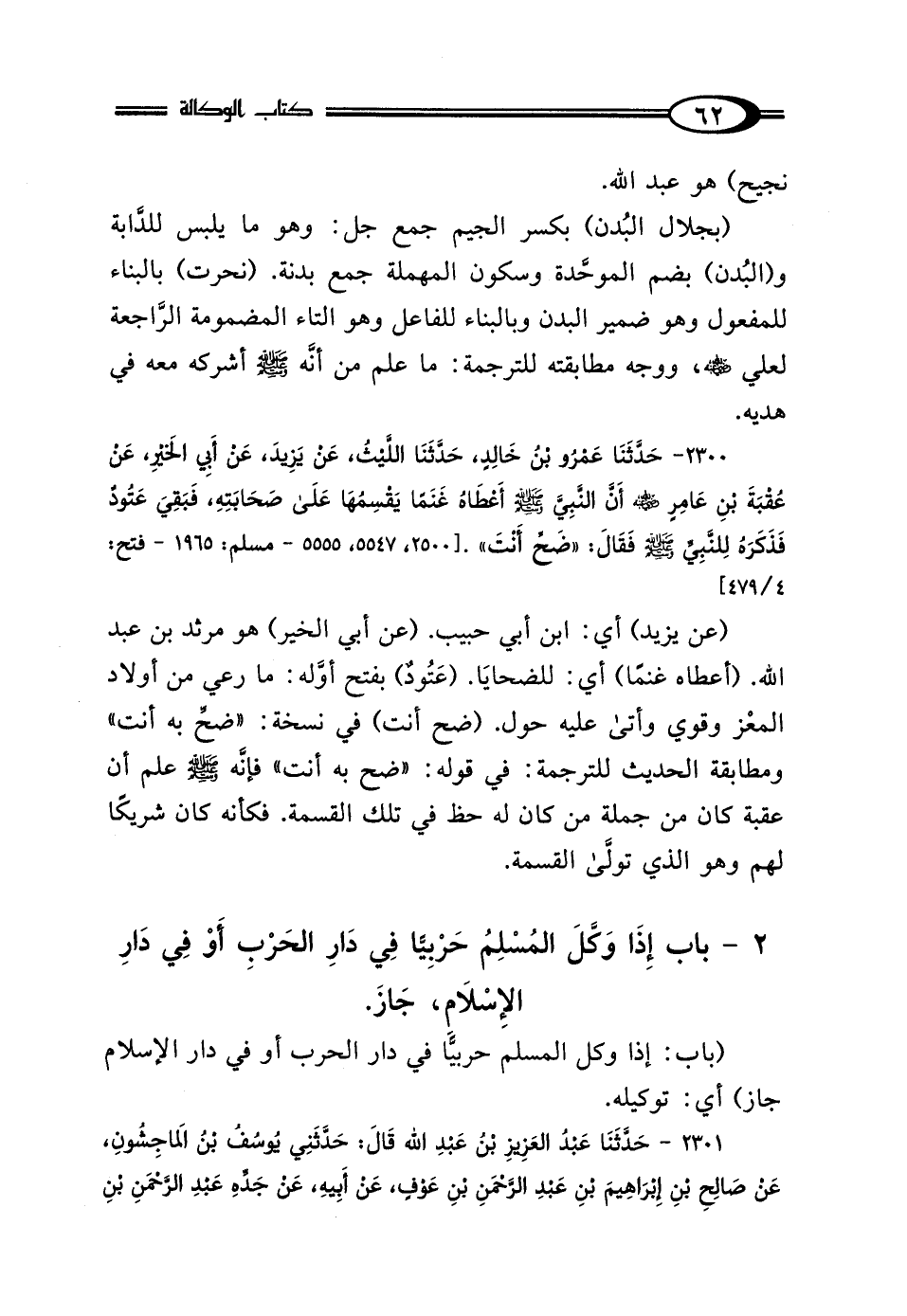 2300 - حَدَّثَنَا عَمْرُو بْنُ خَالِدٍ، حَدَّثَنَا اللَّيْثُ، عَنْ يَزِيدَ، عَنْ أَبِي الخَيْرِ، عَنْ عُقْبَةَ بْنِ عَامِرٍ رَضِيَ اللَّهُ عَنْهُ: أَنَّ النَّبِيَّ صَلَّى اللهُ عَلَيْهِ وَسَلَّمَ أَعْطَاهُ غَنَمًا يَقْسِمُهَا عَلَى صَحَابَتِهِ، فَبَقِيَ عَتُودٌ، فَذَكَرَهُ لِلنَّبِيِّ صَلَّى اللهُ عَلَيْهِ وَسَلَّمَ فَقَال: "ضَحِّ بِهِ أَنْتَ".