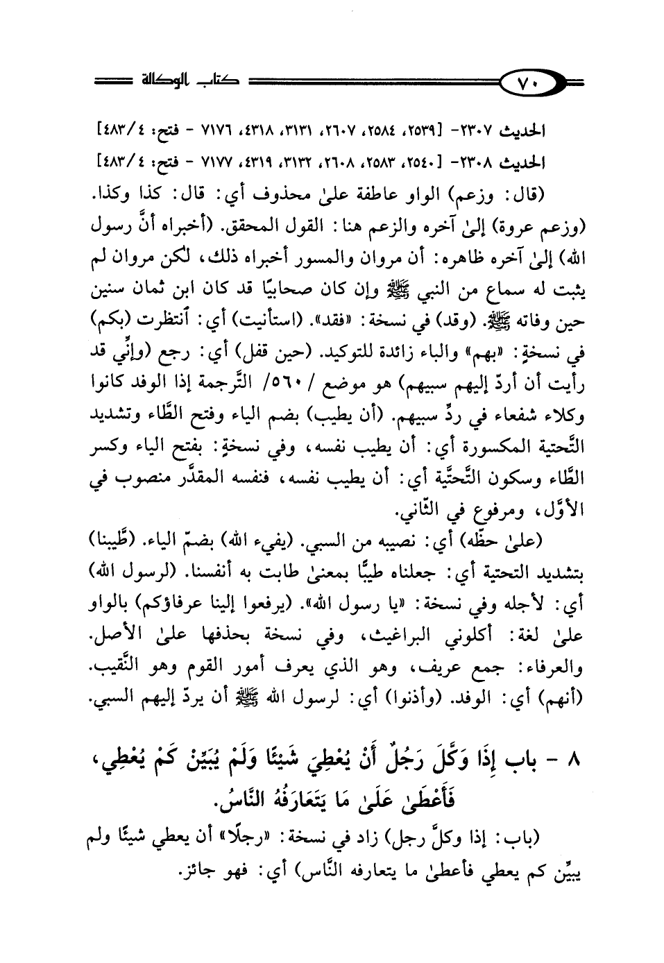 (وزعم عروة) إلى آخره والزعم هنا: القول المحقق. (أخبراه أنَّ رسول الله) إلى آخره ظاهره: أن مروان والمسور أخبراه ذلك، لكن مروان لم يثبت له سماع من النبي - صلى الله عليه وسلم - وإن كان صحابيًّا قد كان ابن ثمان سنين حين وفاته - صلى الله عليه وسلم -. (وقد) في نسخة: "فقد". (استأنيت) أي: انتظرت (بكم) في نسخةٍ: "بهم" والباء زائدة للتوكيد. (حين قفل) أي: رجع (وإنِّي قد رأيت أن أردّ إليهم سبيهم) هو موضع التَّرجمة إذا الوفد كانوا وكلاء شفعاء في ردِّ سبيهم. (أن يطيب) بضم الياء وفتح الطَّاء وتشديد التَّحتية المكسورة أي: أن يطيب نفسه، وفي نسخةٍ: بفتح الياء وكسر الطَّاء وسكون التَّحتيَّة أي: أن يطيب نفسه، فنفسه المقدَّر منصوب في الأوَّل، ومرفوع في الثّاني.