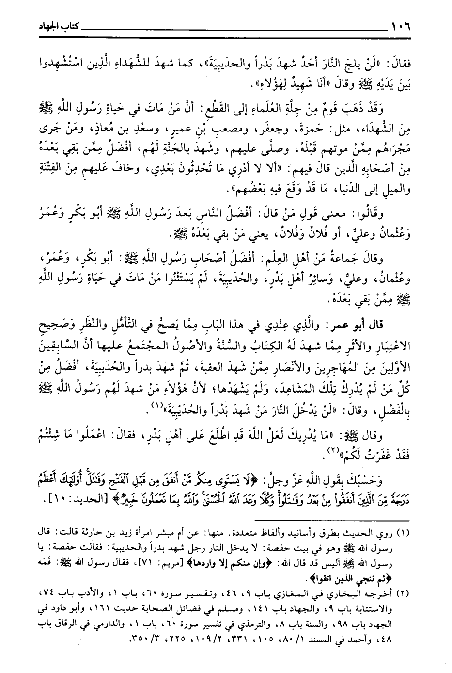 قَالَ أَبُو عُمَرَ وَالَّذِي عِنْدِي فِي هَذَا الْبَابِ مِمَّا يَصِحُّ فِي التأمل والنظر وصحيح الاعتبار والأثر مما شَهِدَ لَهُ الْكِتَابُ وَالسُّنَّةُ وَالْأُصُولُ الْمُجْتَمَعُ عَلَيْهَا أَنَّ السَّابِقِينَ الْأَوَّلِينَ مِنَ الْمُهَاجِرِينَ وَالْأَنْصَارِ مِمَّنْ شَهِدَ الْعَقَبَةَ ثُمَّ شَهِدَ بَدْرًا وَالْحُدَيْبِيَةَ أَفْضَلُ مِنْ كُلِّ مَنْ لَمْ يُدْرِكْ تِلْكَ الْمَشَاهِدَ وَلَمْ يَشْهَدْهَا لِأَنَّ هَؤُلَاءِ مَنْ شَهِدَ لَهُمْ رَسُولُ اللَّهِ صَلَّى اللَّهُ عَلَيْهِ وَسَلَّمَ بِالْفَضْلِ وَقَالَ ((لَنْ يَدْخُلَ النَّارَ مَنْ شَهِدَ بَدْرًا وَالْحُدَيْبِيَةَ))