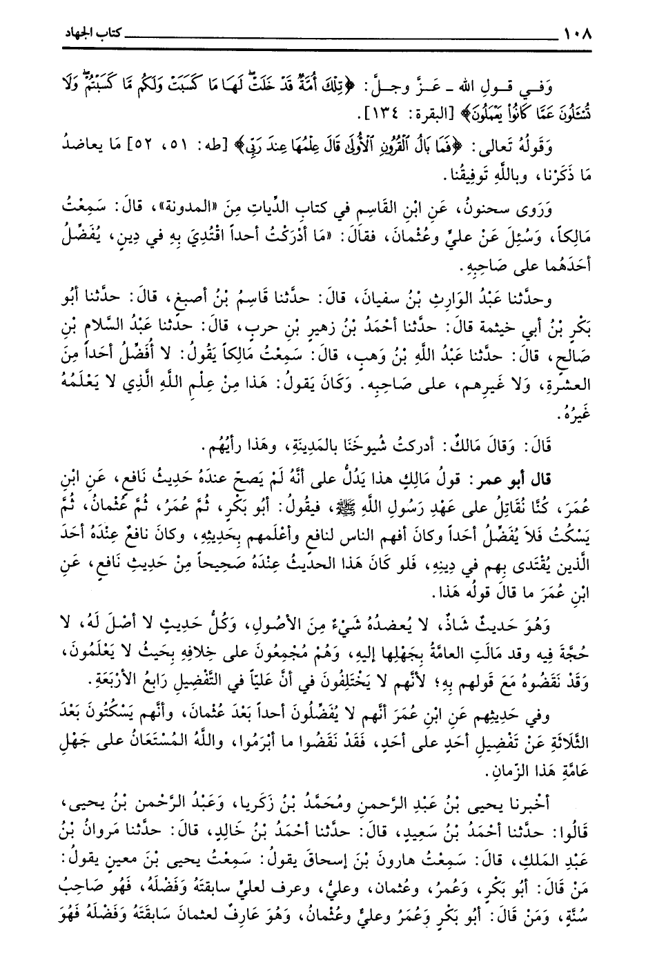 وَحَدَّثَنَا عَبْدُ الْوَارِثِ بْنُ سُفْيَانَ قَالَ حَدَّثَنَا قَاسِمُ بْنُ أَصْبَغَ قَالَ حَدَّثَنَا أَبُو بَكْرِ بْنُ أبي خيثمة قَالَ حَدَّثَنَا أَحْمَدُ بْنُ زُهَيْرِ بْنِ حَرْبٍ قَالَ حَدَّثَنَا عَبْدُ السَّلَامِ بْنُ صَالِحٍ قَالَ حَدَّثَنَا عَبْدُ اللَّهِ بْنُ وَهْبٍ قَالَ سَمِعْتُ مَالِكًا يَقُولُ لَا أُفَضِّلُ أَحَدًا مِنَ الْعَشْرَةِ وَلَا غَيْرَهُمْ عَلَى صَاحِبِهِ وَكَانَ يَقُولُ هَذَا مِنْ عِلْمِ اللَّهِ الَّذِي لَا يَعْلَمُهُ غَيْرُهُ