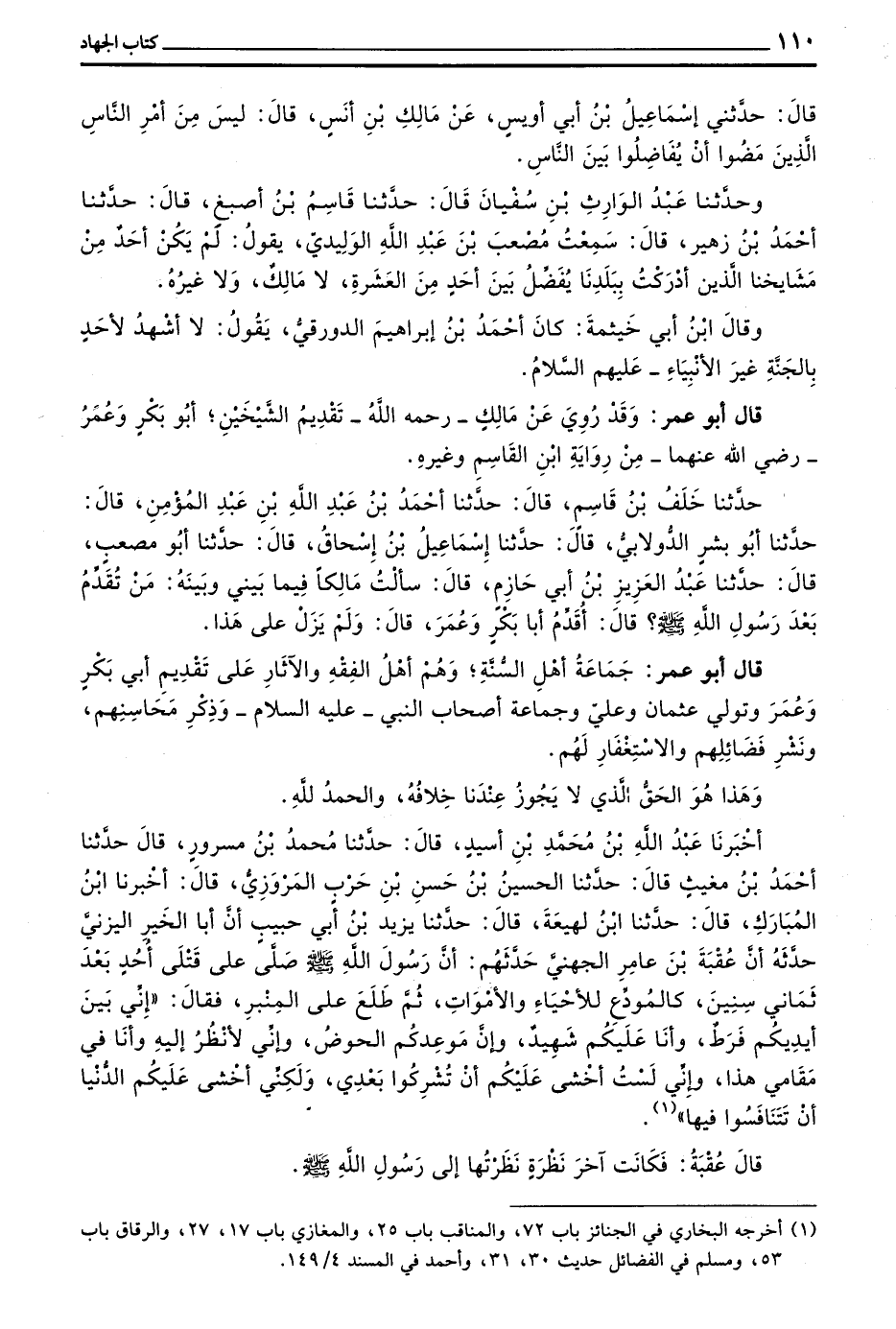 قَالَ أَبُو عُمَرَ جَمَاعَةُ أَهْلِ السُّنَّةِ وَهُمْ أَهْلُ الْفِقْهِ وَالْآثَارِ عَلَى تَقْدِيمِ أَبِي بَكْرٍ وَعُمَرَ وَتَوَلِّي عُثْمَانَ وَعَلِيٍّ وَجَمَاعَةِ أَصْحَابِ النَّبِيِّ عَلَيْهِ السَّلَامُ وَذِكْرِ مَحَاسِنِهِمْ وَنَشْرِ فَضَائِلِهِمْ وَالِاسْتِغْفَارِ لَهُمْ
