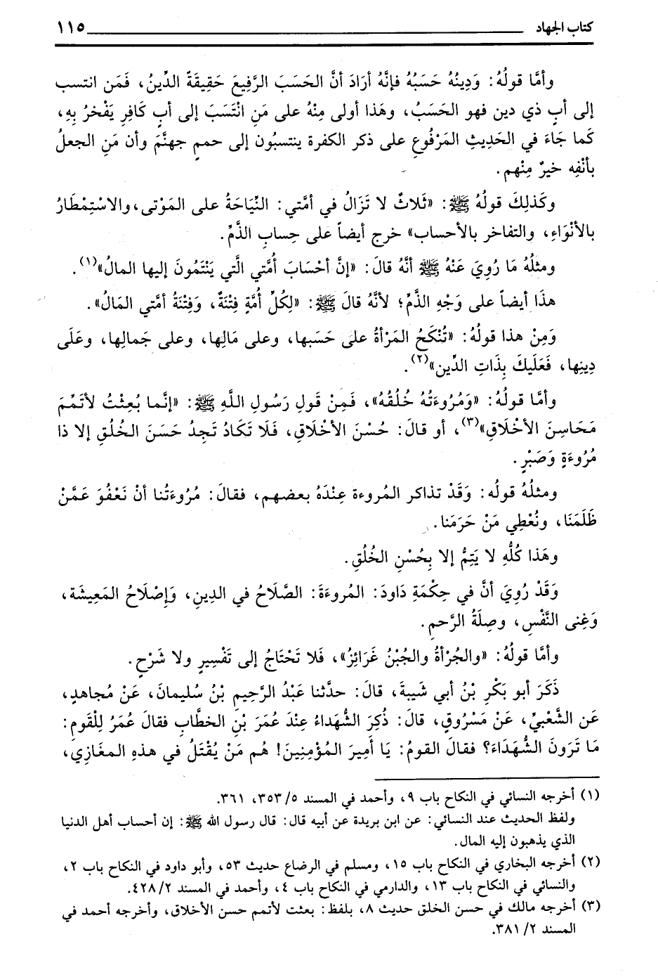 مَنِ انْتَسَبَ إِلَى أَبٍ كَافِرٍ يَفْخَرُ بِهِ كَمَا جَاءَ فِي الْحَدِيثِ الْمَرْفُوعِ عَلَى ذِكْرِ الْكَفَرَةِ يَنْتَسِبُونَ إِلَى حُمَمٍ مِنْ حُمَمِ جَهَنَّمَ وَأَنَّ مَنِ الْجُعْلُ بِأَنْفِهِ خَيْرٌ مِنْهُمْ وَكَذَلِكَ قَوْلُهُ صَلَّى اللَّهُ عَلَيْهِ وَسَلَّمَ ((ثَلَاثٌ لَا تَزَالُ فِي أُمَّتِي النِّيَاحَةُ عَلَى الْمَوْتَى وَالِاسْتِمْطَارُ بِالْأَنْوَاءِ وَالتَّفَاخُرُ بِالْأَحْسَابِ خَرَجَ أَيْضًا عَلَى حِسَابِ الذَّمِّ وَمِثْلُهُ مَا رُوِيَ عَنْهُ صَلَّى اللَّهُ عَلَيْهِ وَسَلَّمَ أَنَّهُ قَالَ إِنَّ أَحْسَابَ أُمَّتِي الَّتِي يَنْتَمُونَ إِلَيْهَا الْمَالُ هَذَا أَيْضًا عَلَى وَجْهِ الذَّمِّ لِأَنَّهُ قَالَ صَلَّى اللَّهُ عَلَيْهِ وَسَلَّمَ لِكُلِّ أُمَّةٍ فِتْنَةٌ وَفِتْنَةُ أُمَّتِيِ الْمَالُ وَمِنْ هَذَا قَوْلُهُ تُنْكَحُ الْمَرْأَةُ عَلَى حَسَبِهَا وَعَلَى مَالِهَا وَعَلَى جَمَالِهَا وَعَلَى دِينِهَا فَعَلَيْكَ بِذَاتِ الدِّينِ وَأَمَّا قَوْلُهُ وَمُرُوءَتُهُ خُلُقُهُ فَمِنْ قول رسول الله صلى الله عليه وسلم إِنَّمَا بُعِثْتُ لِأُتَمِّمَ مَحَاسِنَ الْأَخْلَاقِ أَوْ قَالَ حُسْنُ الْأَخْلَاقِ فَلَا تَكَادُ تَجِدُ حَسَنَ الْخُلُقِ إِلَّا ذَا مُرُوءَةٍ وَصَبْرٍ وَمِثْلُهُ قَوْلُهُ وَقَدْ تَذَاكَرَ الْمُرُوءَةَ عِنْدَهُ بَعْضُهُمْ فَقَالَ مُرُوءَتُنَا أَنْ نَعْفُوَ عَمَّنْ ظَلَمَنَا وَنُعْطِيَ مَنْ حَرَمَنَا وَهَذَا كُلُّهُ لَا يَتِمُّ إِلَّا بِحُسْنِ الْخُلُقِ وَقَدْ روي أنه فِي حِكْمَةِ دَاوُدَ الْمُرُوءَةَ الصَّلَاحُ فِي الدِّينِ وَإِصْلَاحُ الْمَعِيشَةِ وَغِنَى النَّفْسِ وَصِلَةُ الرَّحِمِ وَأَمَّا قَوْلُهُ وَالْجُرْأَةُ وَالْجُبْنُ غَرَائِزُ فَلَا تَحْتَاجُ إِلَى تَفْسِيرٍ وَلَا شَرْحٍ ذَكَرَ أَبُو بَكْرِ بْنُ أَبِي شَيْبَةَ قَالَ حَدَّثَنَا عَبْدُ الرَّحِيمِ بْنُ سُلَيْمَانَ عَنْ مُجَاهِدٍ عَنِ الشَّعْبِيِّ عَنْ مَسْرُوقٍ قَالَ ذُكِرَ الشُّهَدَاءُ عِنْدَ عُمَرَ بْنِ الْخَطَّابِ فقال عمر للقوم مَا تَرَوْنَ الشُّهَدَاءَ فَقَالَ الْقَوْمُ يَا أَمِيرَ الْمُؤْمِنِينَ هُمْ مَنْ يُقْتَلُ فِي هَذِهِ الْمَغَازِي