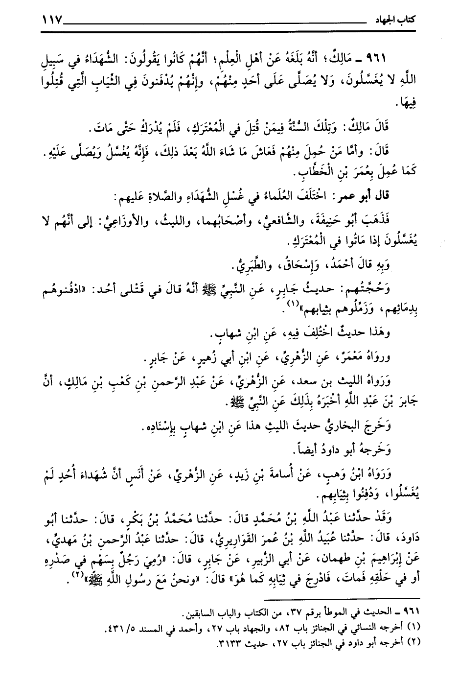 961 - مَالِكٌ أَنَّهُ بَلَغَهُ عَنْ أَهْلِ الْعِلْمِ أَنَّهُمْ كَانُوا يَقُولُونَ الشُّهَدَاءُ فِي سَبِيلِ اللَّهِ لَا يُغَسَّلُونَ وَلَا يُصَلَّى عَلَى أَحَدٍ مِنْهُمْ وَأَنَّهُمْ يُدْفَنُونَ فِي الثِّيَابِ الَّتِي قُتِلُوا فِيهَا