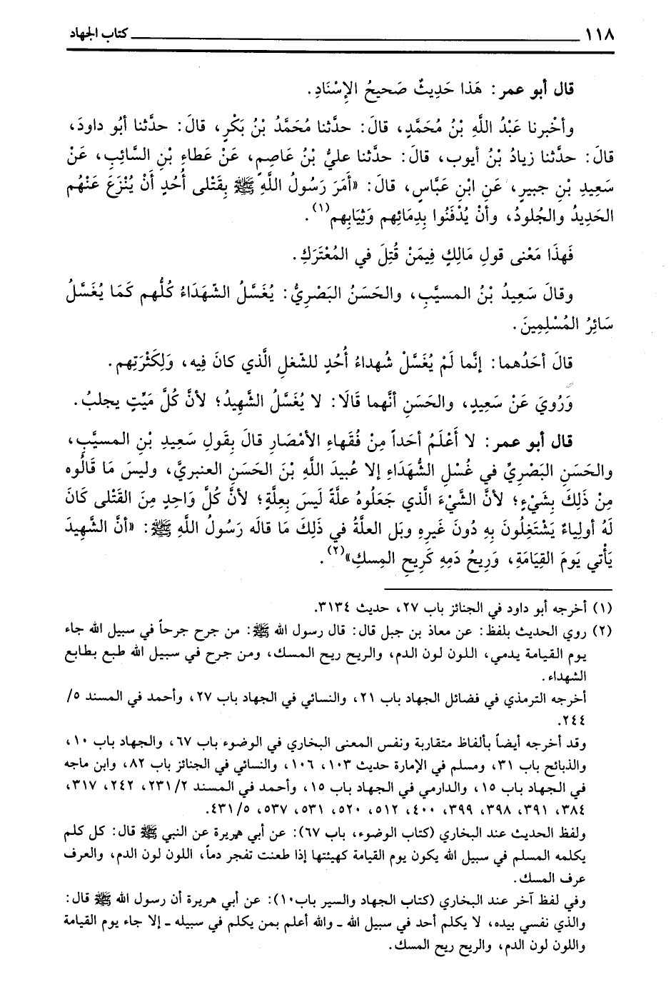 قَالَ أَبُو عُمَرَ لَا أَعْلَمُ أَحَدًا مِنَ فُقَهَاءِ الْأَمْصَارِ قَالَ بِقَوْلِ سَعِيدِ بْنِ الْمُسَيَّبِ وَالْحَسَنِ الْبَصْرِيِّ فِي غُسْلِ الشُّهَدَاءِ إِلَّا عَبِيدَ اللَّهِ بْنَ الْحَسَنِ الْعَنْبَرِيَّ وَلَيْسَ مَا قَالُوهُ مِنْ ذَلِكَ بِشَيْءٍ لِأَنَّ الشَّيْءَ الَّذِي جَعَلُوهُ عِلَّةً لَيْسَ بِعِلَّةٍ لِأَنَّ كُلَّ وَاحِدٍ مِنَ الْقَتْلَى كَانَ لَهُ أولياء يشتغلون به دون غيره وبل الْعِلَّةُ فِي ذَلِكَ مَا قَالَهُ رَسُولُ اللَّهِ صَلَّى اللَّهُ عَلَيْهِ وَسَلَّمَ ((أَنَّ الشَّهِيدَ يَأْتِي يَوْمَ الْقِيَامَةِ وَرِيحُ دَمِهِ كَرِيحِ الْمِسْكِ